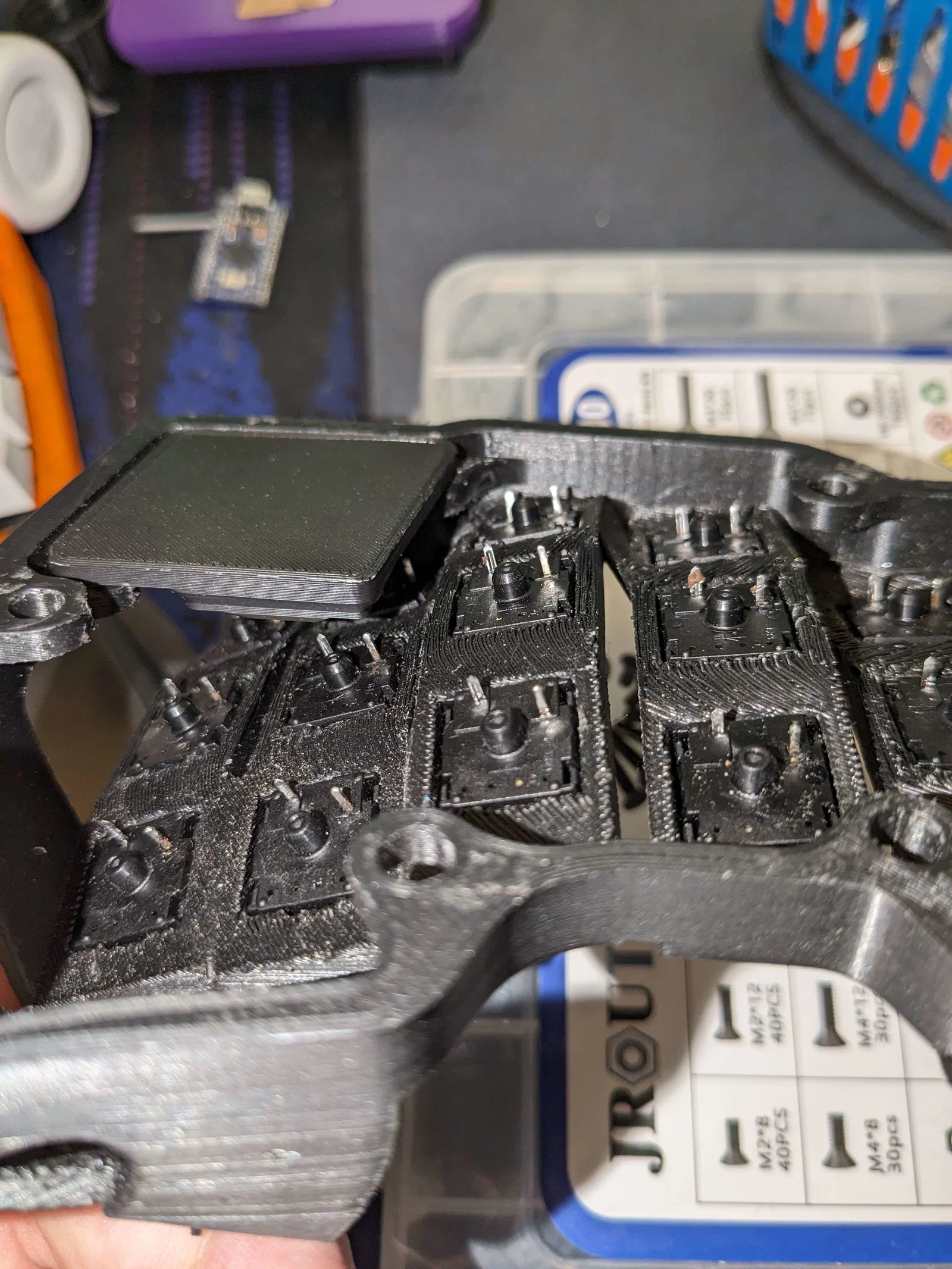 Mô hình được dán nhãn V7 là vì mình đã làm tới 7 bản mẫu nhanh để có được độ khít và hoàn thiện như ý muốn, xài là ngon lành với mình rồi. Con Scylla của mình không có handwire nhưng mình lười đặt làm cái tấm chắn PCB nên cần cái đế in 3D này. Khó chịu ghê cái vụ nó không giữ jack TRRS, làm ráp cái bàn phím nguyên con mà không có keo thì bực mình.