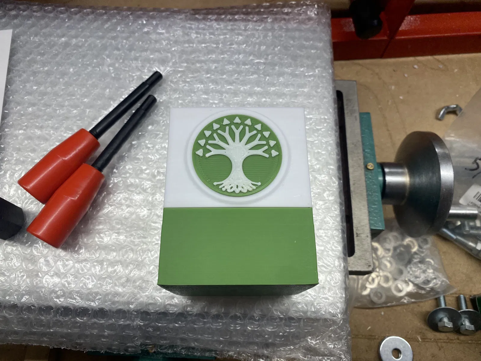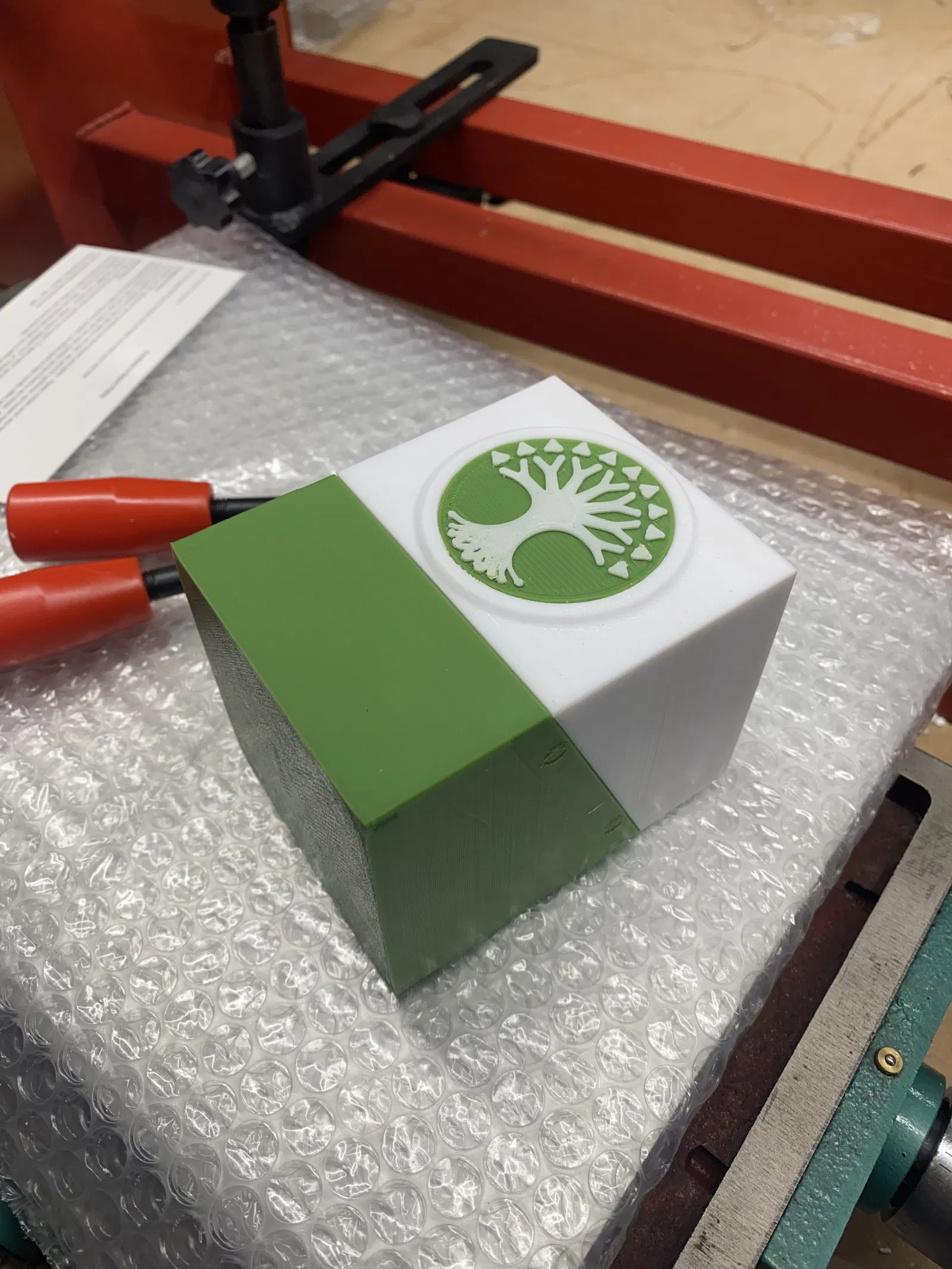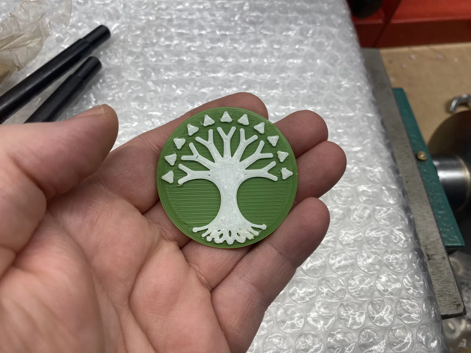 Một trong những huy hiệu logo (Gruul) là thiết kế 3 màu. Bạn có thể làm bằng cách kết hợp mẹo thay đổi filament ở lớp X cộng với việc in riêng màu thứ ba, rồi dùng keo 502 dán các phần của màu thứ ba vào đúng vị trí. Để làm theo cách này, hãy kết hợp (trong slicer của bạn) STL đế logo và một trong hai màu, và nếu không dùng MMU, hãy điều chỉnh chiều cao của STL màu bổ sung lên gấp 2 lần chiều cao của STL đế, sau đó thêm chỉ dẫn thay đổi filament ở lớp X. Lý do: STL đế có các lỗ cho cả hai màu còn lại, dành cho những người dùng MMU.