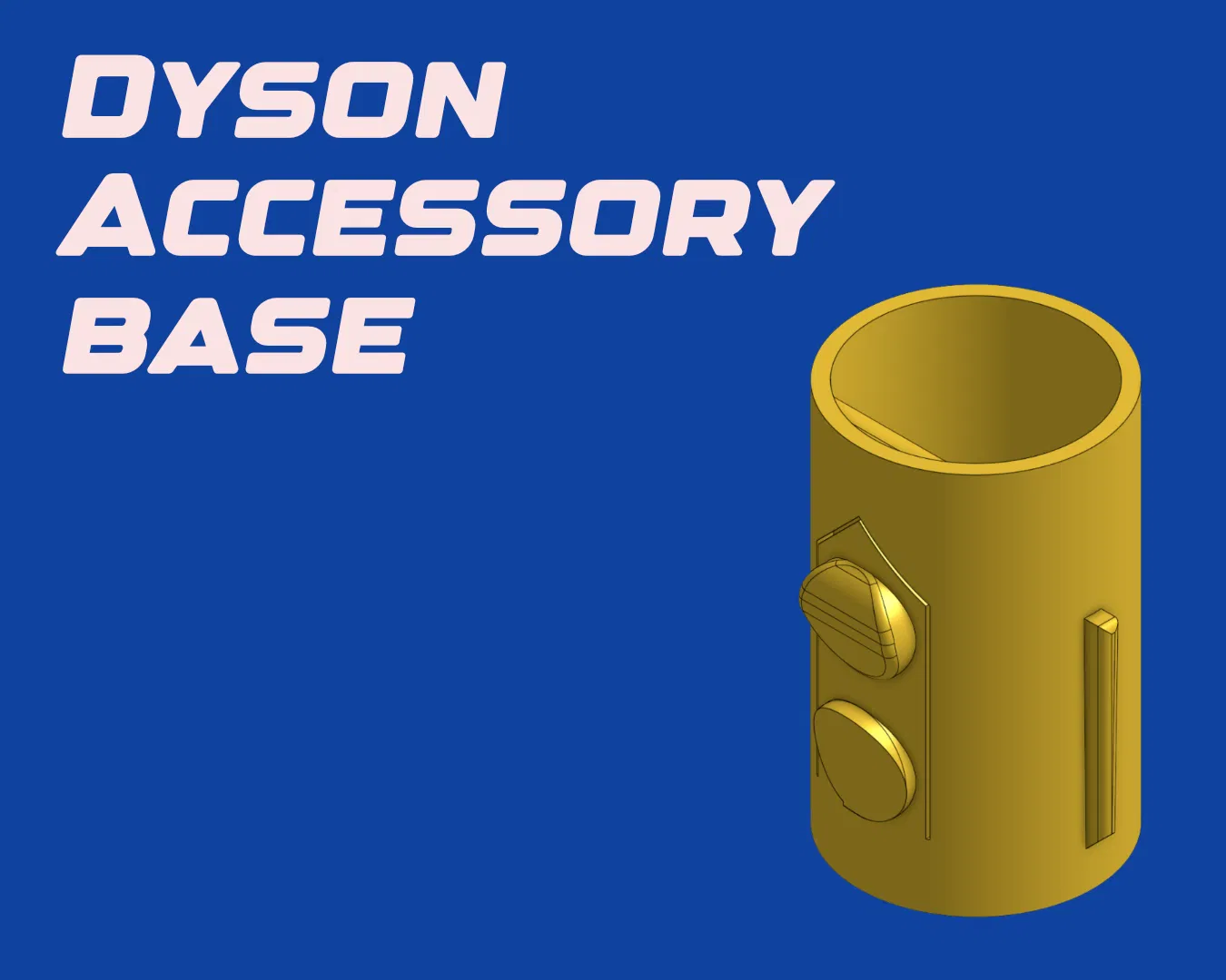Mẫu đế này dùng để tạo phụ kiện mới cho máy hút bụi Dyson đời V7 trở lên. Đế có cơ chế tháo lắp phụ kiện tiện lợi, được in đứng không cần hỗ trợ. Khuyến khích dùng PETG để đảm bảo độ bền, in với vòi 0.4 và lớp 0.2.