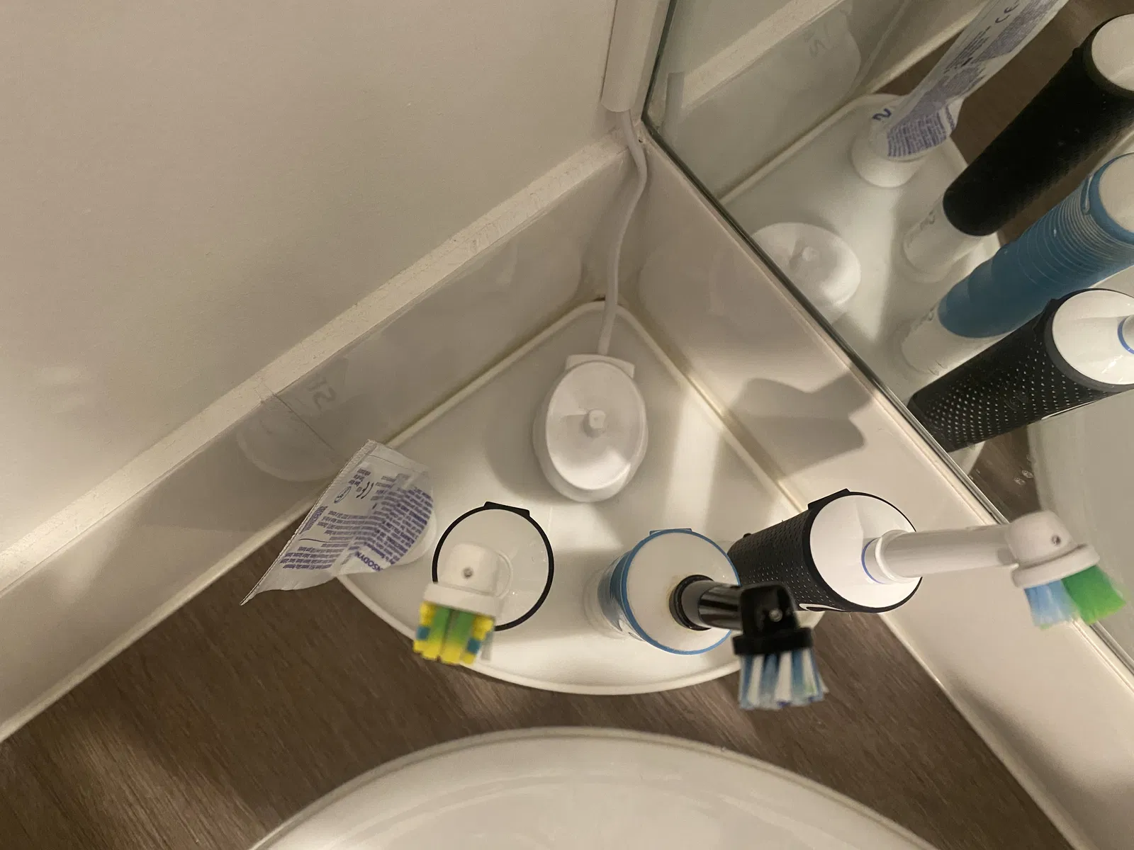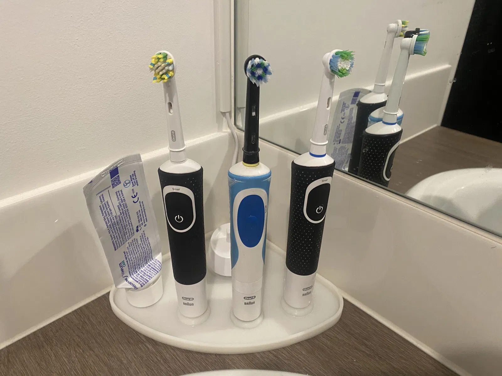 Kệ đựng bàn chải đánh răng Oral B cho 3 bàn chải, sạc và có chỗ để kem đánh răng nữa.