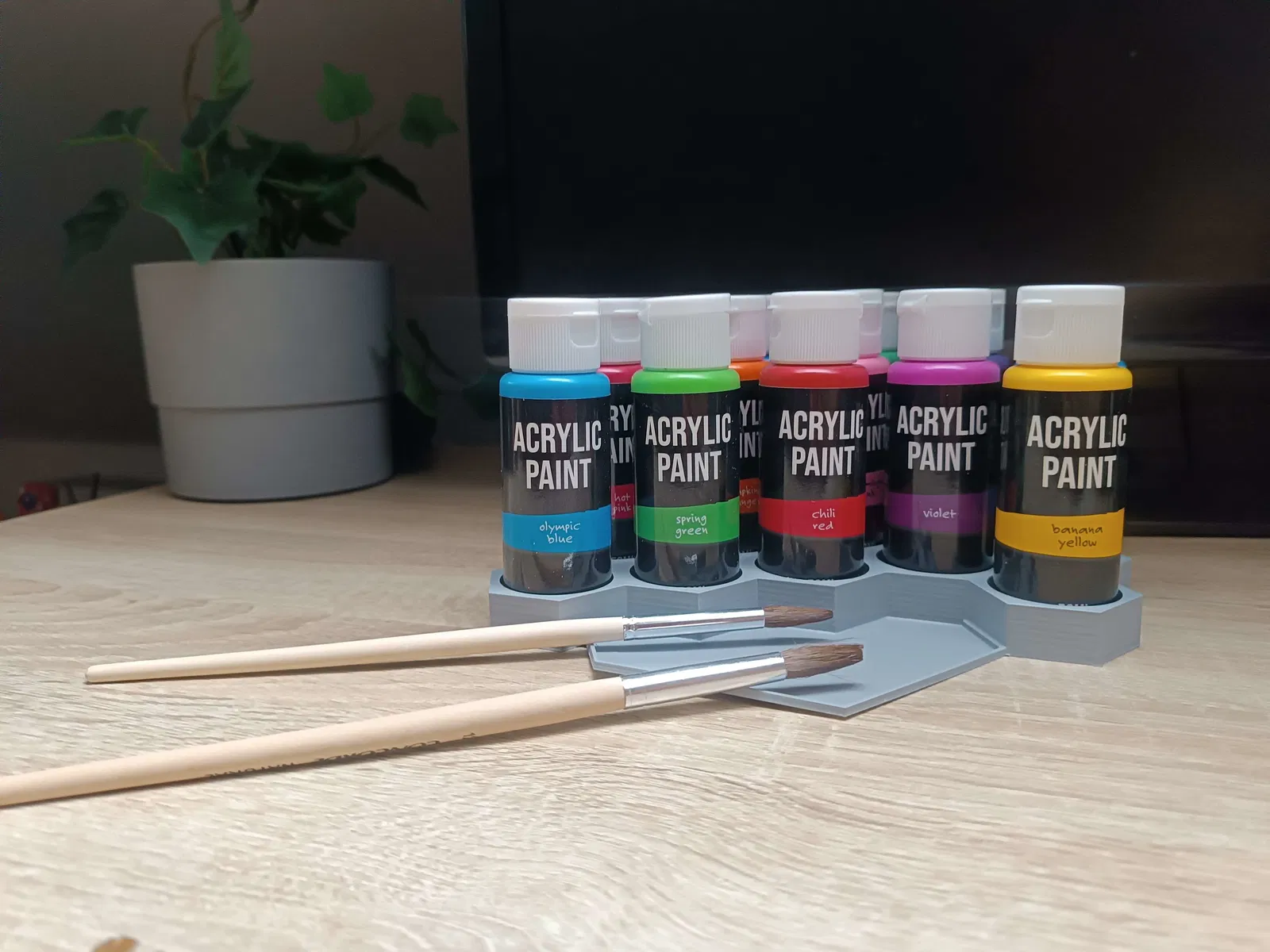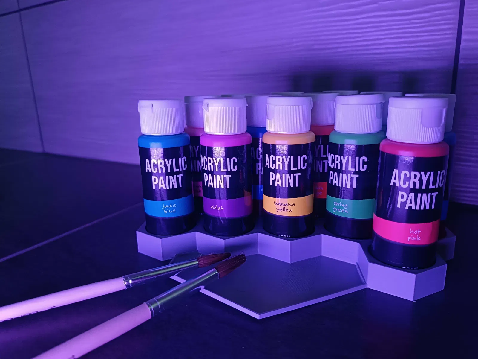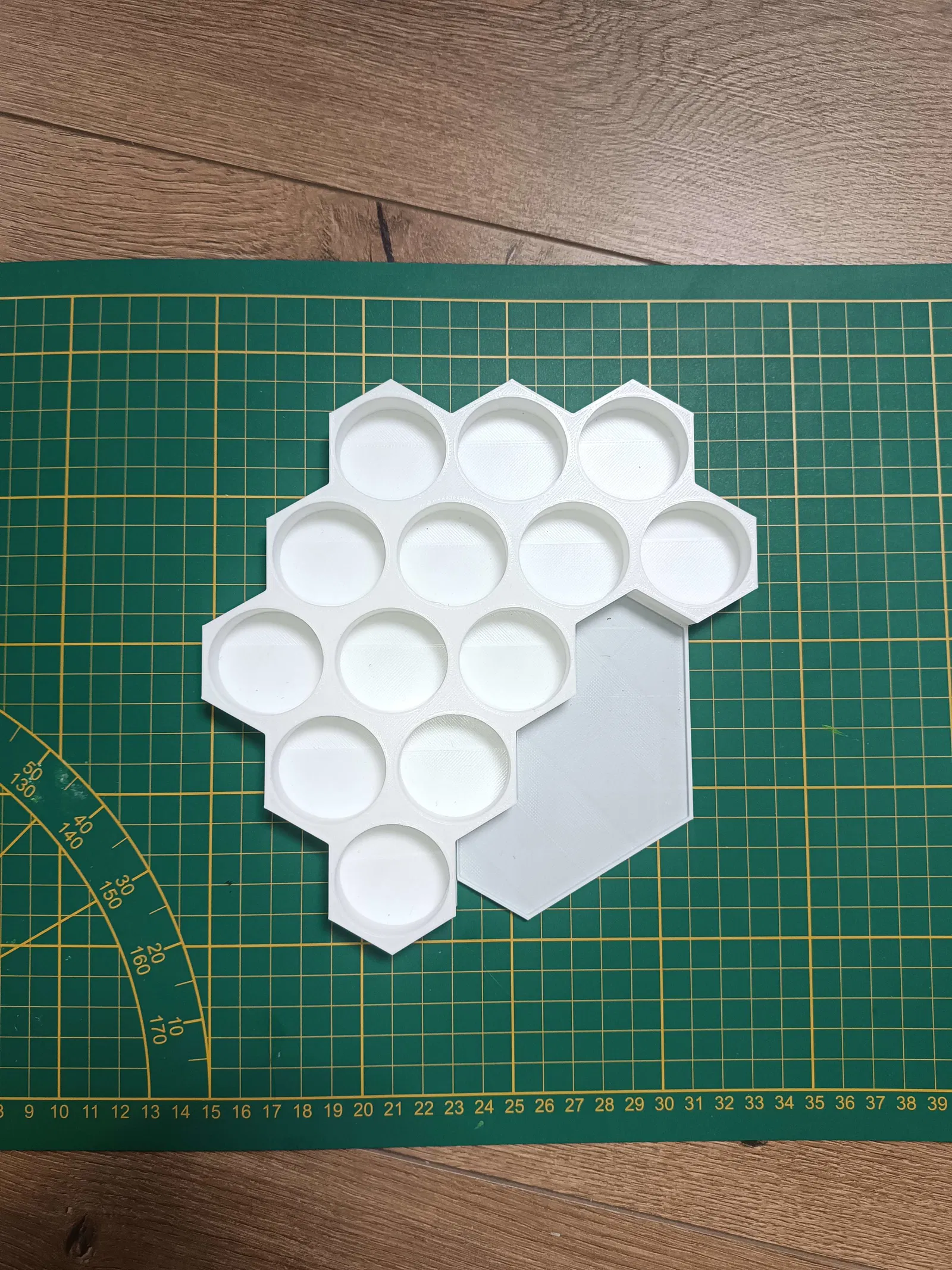 Mẫu đế cắm sơn hình lục giác đơn giản, có chỗ để màu vẽ. Kích thước lỗ phù hợp với hầu hết các loại lọ sơn phổ biến, giúp việc sắp xếp và sử dụng màu vẽ trở nên gọn gàng và tiện lợi hơn.
