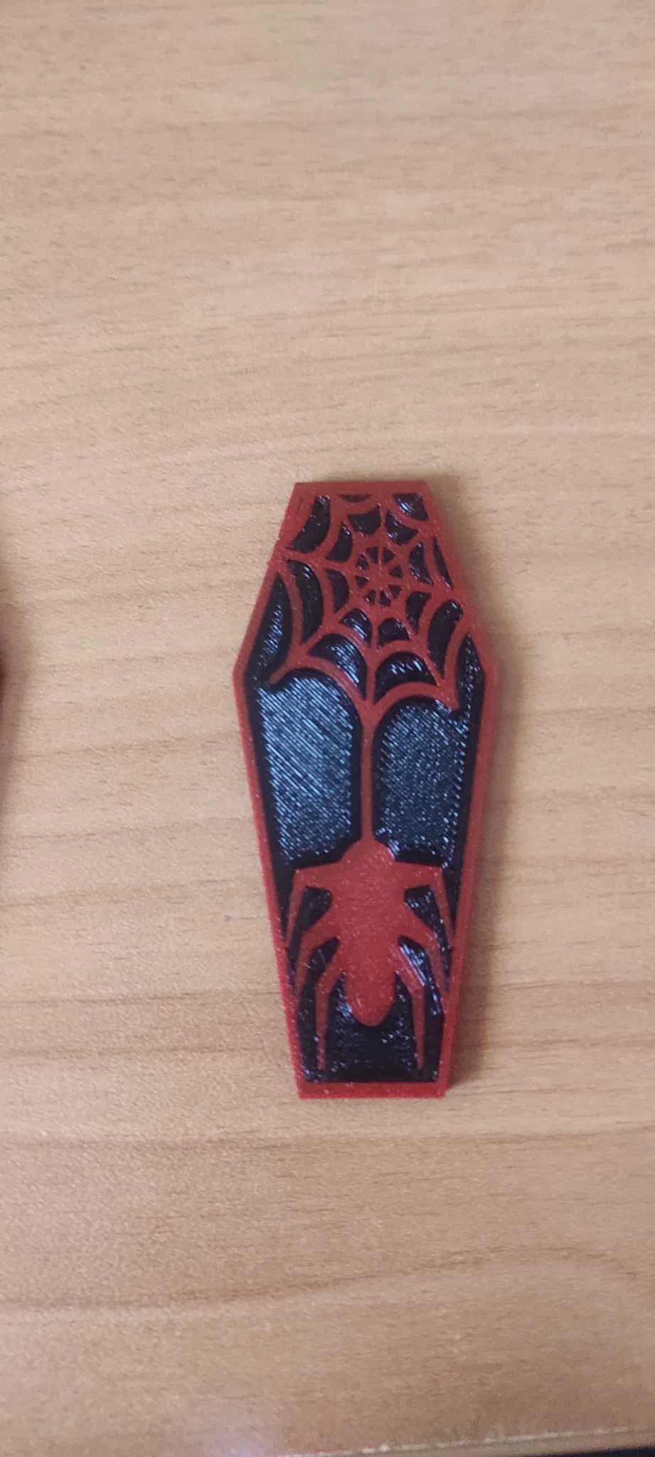 Móc khóa hình quan tài với nhện, có thể làm thành mặt dây chuyền, bông tai. Thích hợp cho những ai yêu thích phong cách ma mị, kinh dị. Hướng dẫn in 2 màu chi tiết.