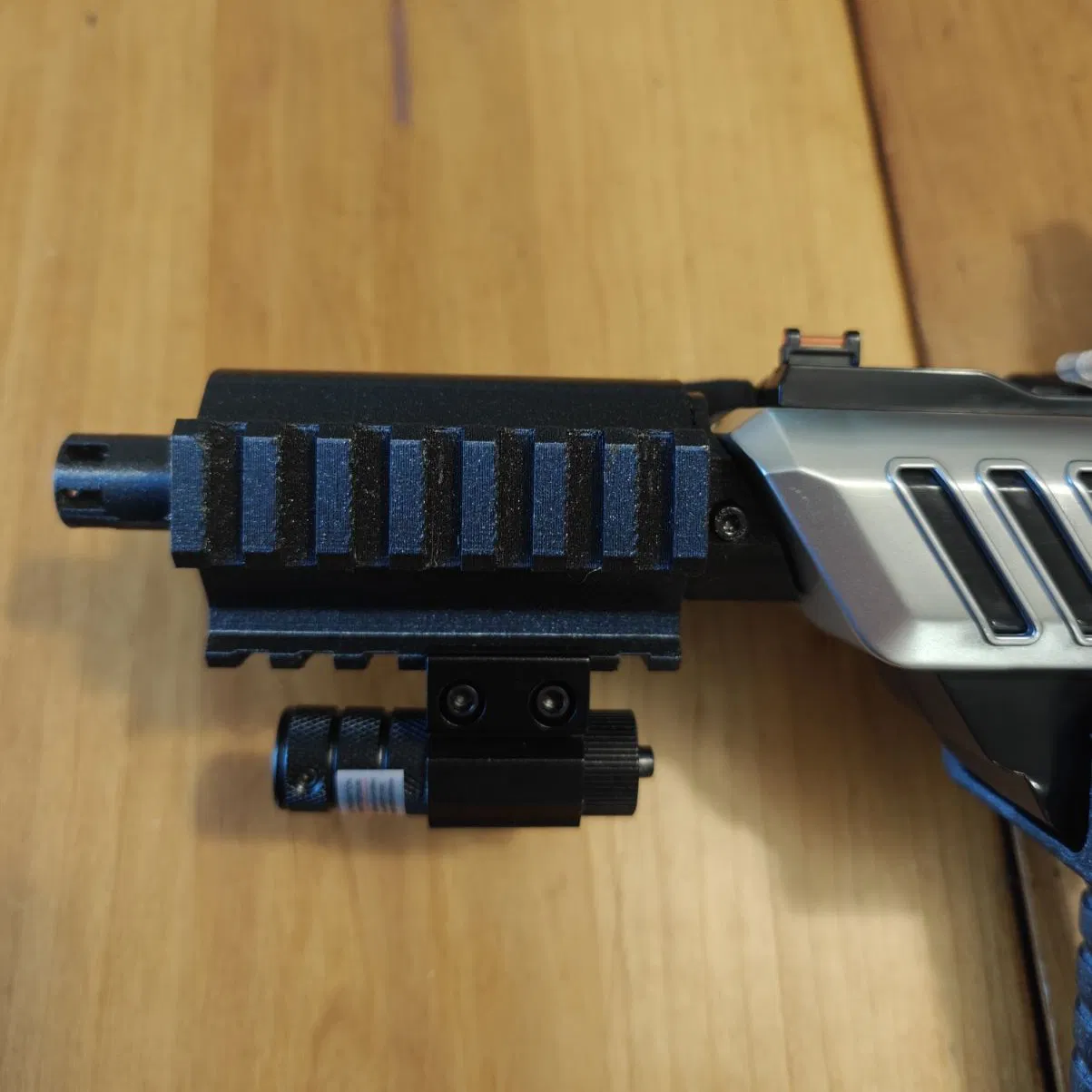 - Chỉ cần trượt ray nòng vào; keo dán/ốc vít thực ra không cần thiết nếu bạn không có gì kéo vào nó như dây đeo. Bạn có thể sẽ ổn với một chiếc đèn pin nhỏ hoặc laser.