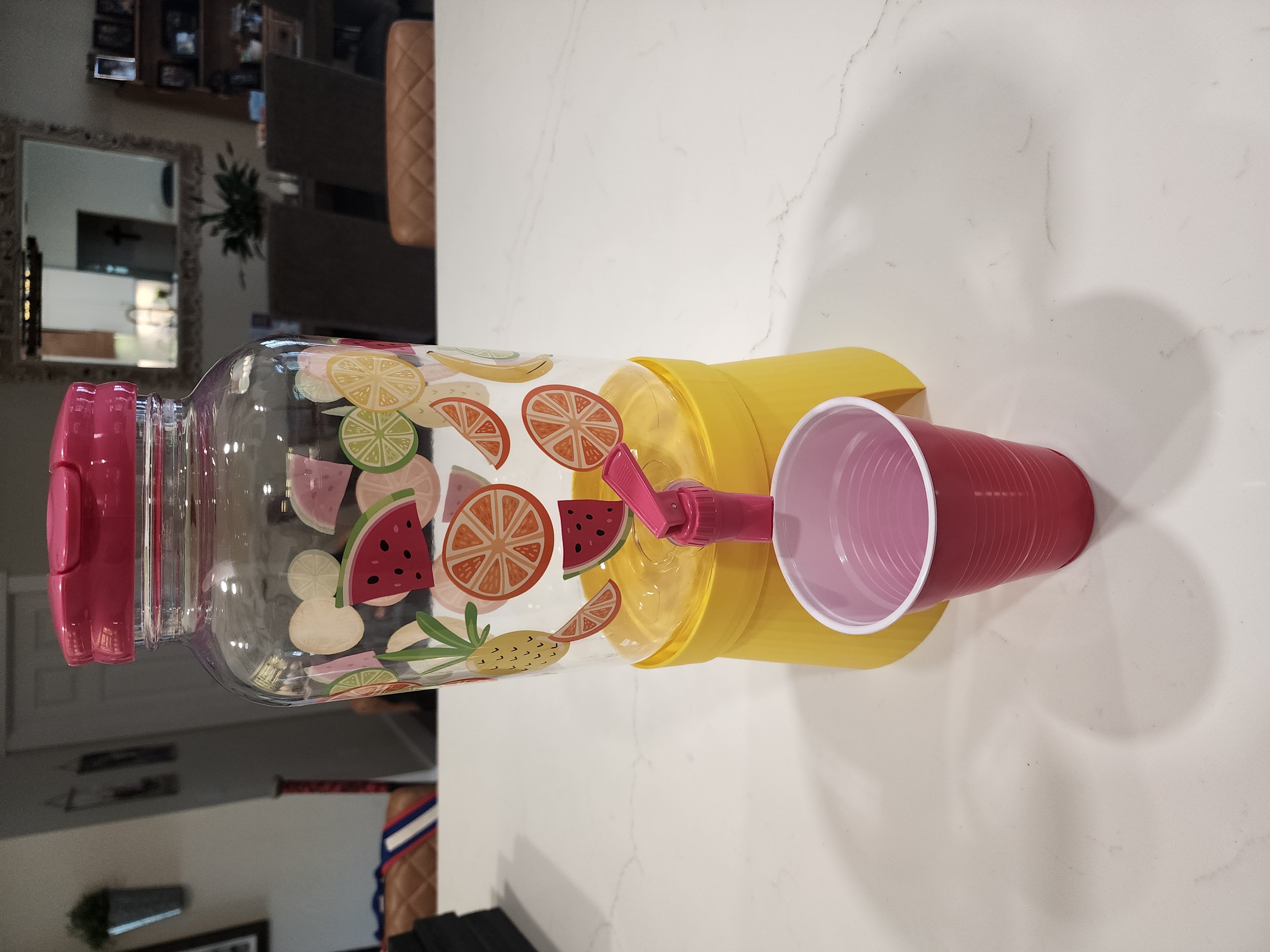 Bà xã tui mới mua mấy cái bình đựng nước cỡ 1 gallon giá rẻ ở WalMart có 5 đô mỗi cái cho buổi tiệc sắp tới, mà nó hổng có kèm cái đế hay chân đế gì hết trơn á, nên là mình đâu có để ly vô hứng nước được (trừ khi để mép bàn). Tui mới thiết kế cái này bằng Tinkercad rồi in ra xài thử hai cái.