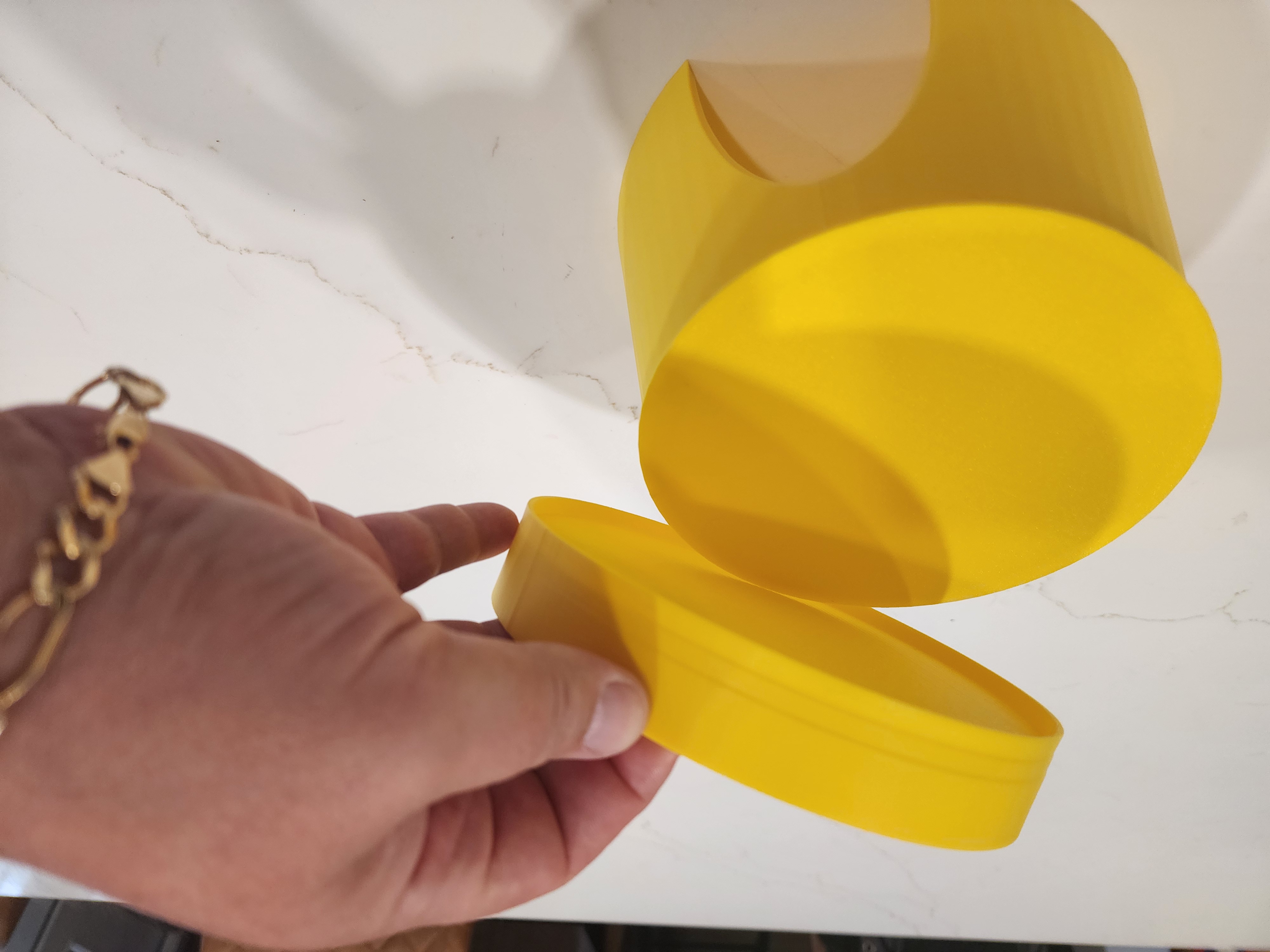 Cái đế này giúp nâng bình nước lên cao để bạn có thể đặt ly dưới vòi hứng. Đế được in 2 mảnh, có gờ giữ bình và khay chắc chắn. In bằng PLA, không cần support cho phần đế khi in úp ngược.