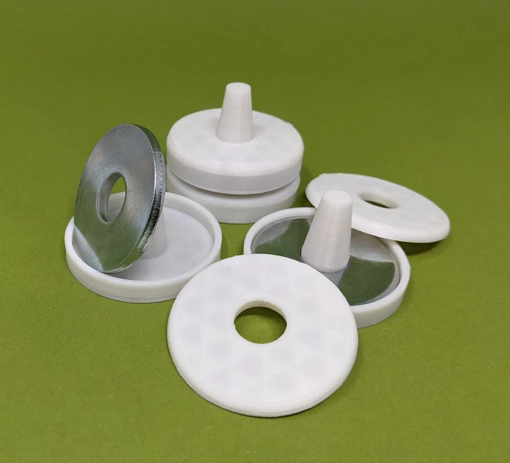 Mẫu cục chặn vải đơn giản, xếp chồng lên nhau, được thiết kế để hỗ trợ việc may vá. Sử dụng vòng đệm (washers) để tạo trọng lượng, có tùy chọn thêm nắp để tăng tính thẩm mỹ. Dễ dàng in ấn với các cài đặt gợi ý.