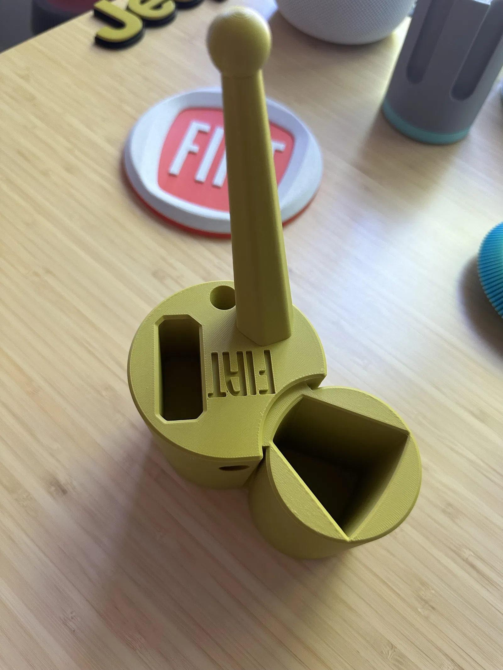 Mình thiết kế cái đế giữ điện thoại trong hộc đựng ly này để tận dụng tốt hơn chỗ để điện thoại, kính râm và remote cửa cuốn. Nó chiếm 2 chỗ đựng ly nha. Các bạn xem hình ảnh kỹ để đảm bảo nó vừa với xe Fiat 500 của bạn nha, mình có kèm theo hình ảnh báo chí gốc cho thấy cái hộc đựng ly đặc biệt mà cái này được làm cho. Logo Fiat được vẽ lại và làm nổi trên đế giữ, và có một đường dẫn xuyên qua đế để đi dây sạc gọn gàng từ tẩu thuốc lên chỗ để điện thoại. Cái trụ để điện thoại được thiết kế để giữ loại kẹp điện thoại tự động đóng như cái mình mua trên amazon này. Nó có một cục tròn ở đầu trụ, được thiết kế để khớp với hầu hết các loại kẹp điện thoại. Đường kính của cục tròn là 18mm. Lựa chọn thứ hai cho phép điện thoại ở xa khu vực cần số hơn, nhưng nó sẽ nằm đè lên phanh tay - nên sẽ vướng víu nếu bạn cần dùng phanh tay. Mình thích thiết kế này vì dễ dàng để iPhone vào đế giữ hơn và mình vẫn có thể dùng phanh tay, chỉ là nó không dễ tiếp cận bằng nữa khi có điện thoại che lên. Nếu bạn lo ngại phanh tay bị vướng, mình có một mẫu khác gắn vào cổng TomTom ở đây: Cái kẹp điện thoại mình mua (nhưng có nhiều loại tương tự): https://www.amazon.com/dp/B0BL1S9LFJ?psc=1&ref=ppx_yo2ov_dt_b_product_details Khe để remote cửa cuốn được thiết kế cho remote Chamberlain/Lift Master. Chỗ để kính râm nên vừa với hầu hết các loại kính (kính Maui Jim để vừa đẹp). Không cần support, dùng brim hoặc raft nếu gặp vấn đề với độ bám của bàn in. Khuyên dùng Infill 65% trở lên (Mình in mẫu này ở 70%)
