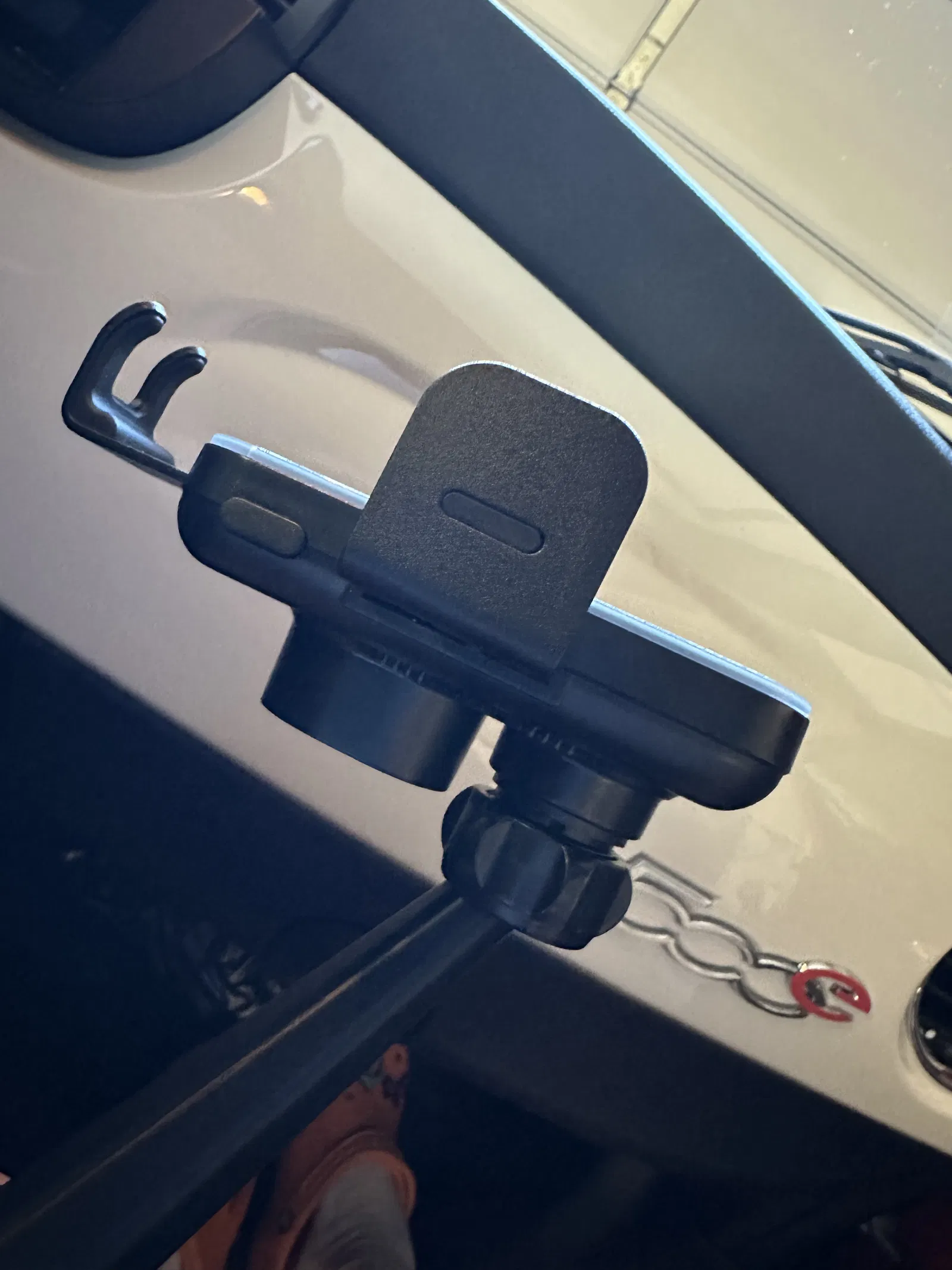 Giá đỡ điện thoại kiêm chỗ để kính râm và remote cửa cuốn, thiết kế riêng cho hộc ly Fiat 500. Có hai lựa chọn vị trí, tích hợp cổng sạc và logo Fiat. Không cần support, khuyên dùng infill 65%+.