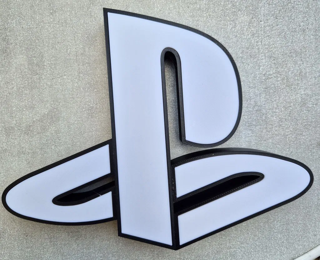 Mẫu đèn LED hình logo Playstation, kích thước khoảng 200 x 200 mm. Thích hợp cho người yêu thích game và DIY. Cài đặt in gợi ý: độ phân giải 0.2 mm, infill 15%, sử dụng filament PLA hoặc PETG màu đen, trắng.