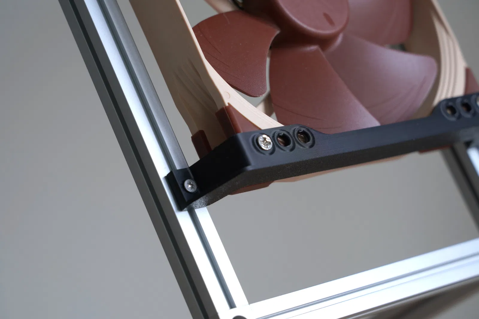 Đây là một giá đỡ quạt rất đơn giản, chỉ cần bắt vít vào các đai ốc nằm trong các thanh nhôm Makerbeam XL. Nó rất chắc chắn, nhưng không tiết kiệm không gian như giá đỡ quạt một mặt hoặc loại lắp trượt.
