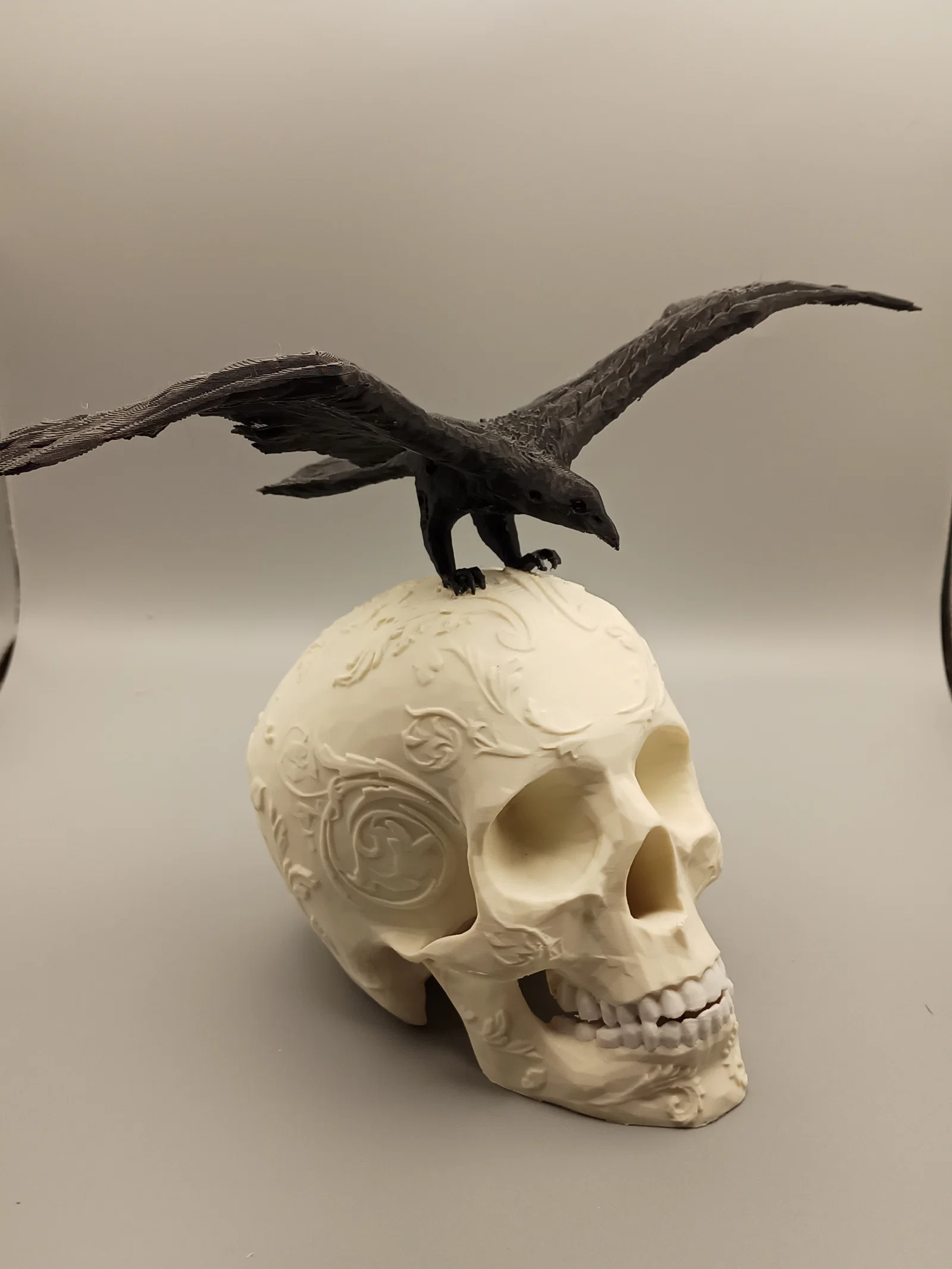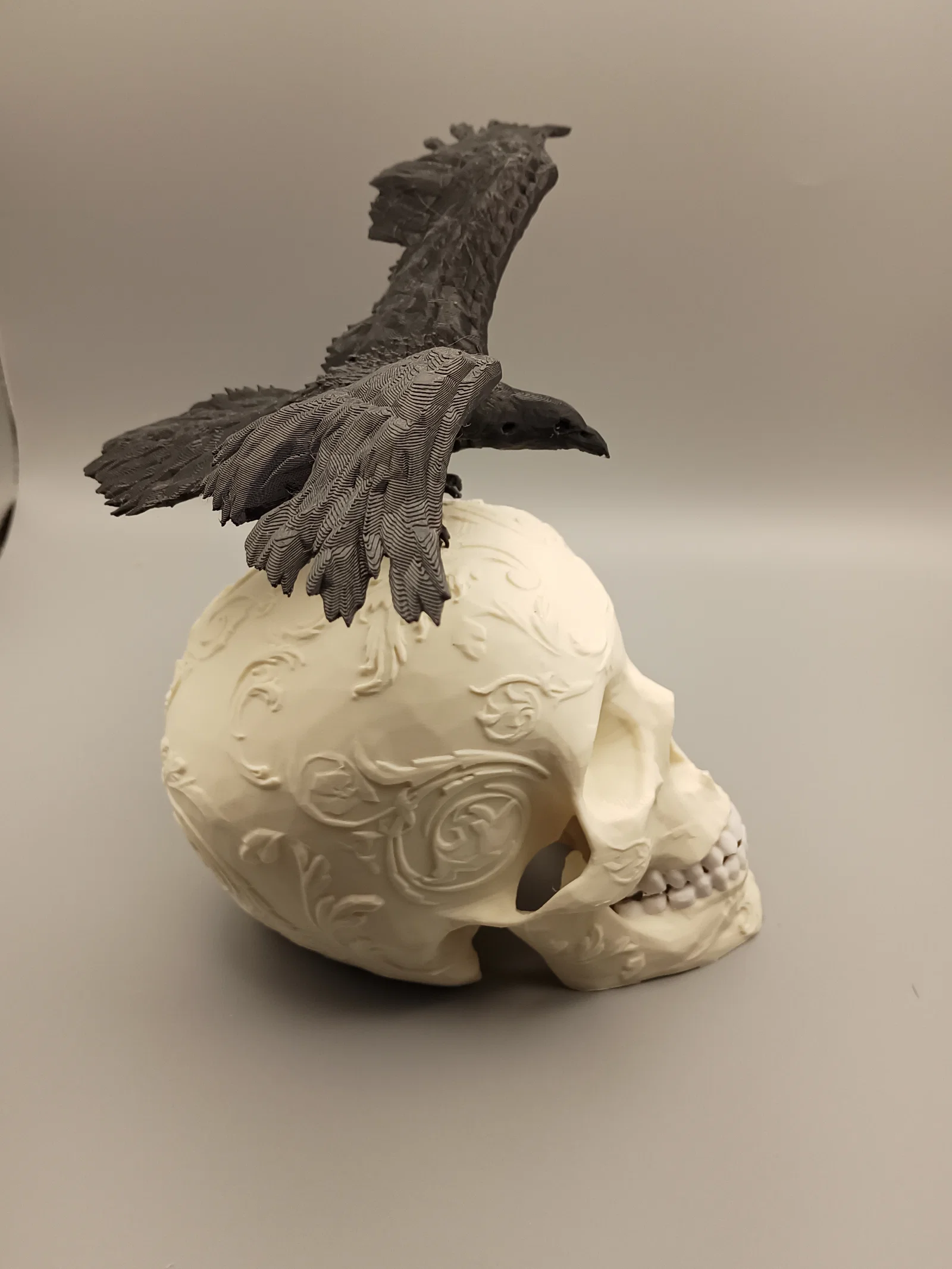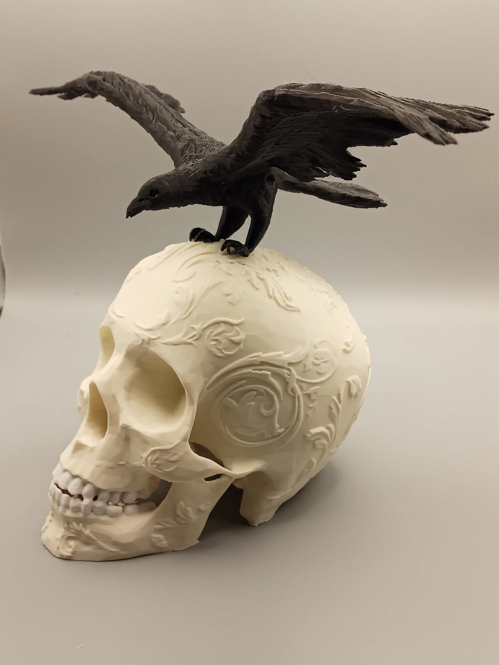 Một mẫu đầu lâu trang trí có con quạ dang cánh đậu trên đỉnh. In được một khối. Mẫu này cần có hỗ trợ khi in. Tác giả đã kết hợp nhiều mẫu có sẵn để tạo ra nó, in bằng máy Bambu Lab P1S với 4 màu nhựa PLA khác nhau.