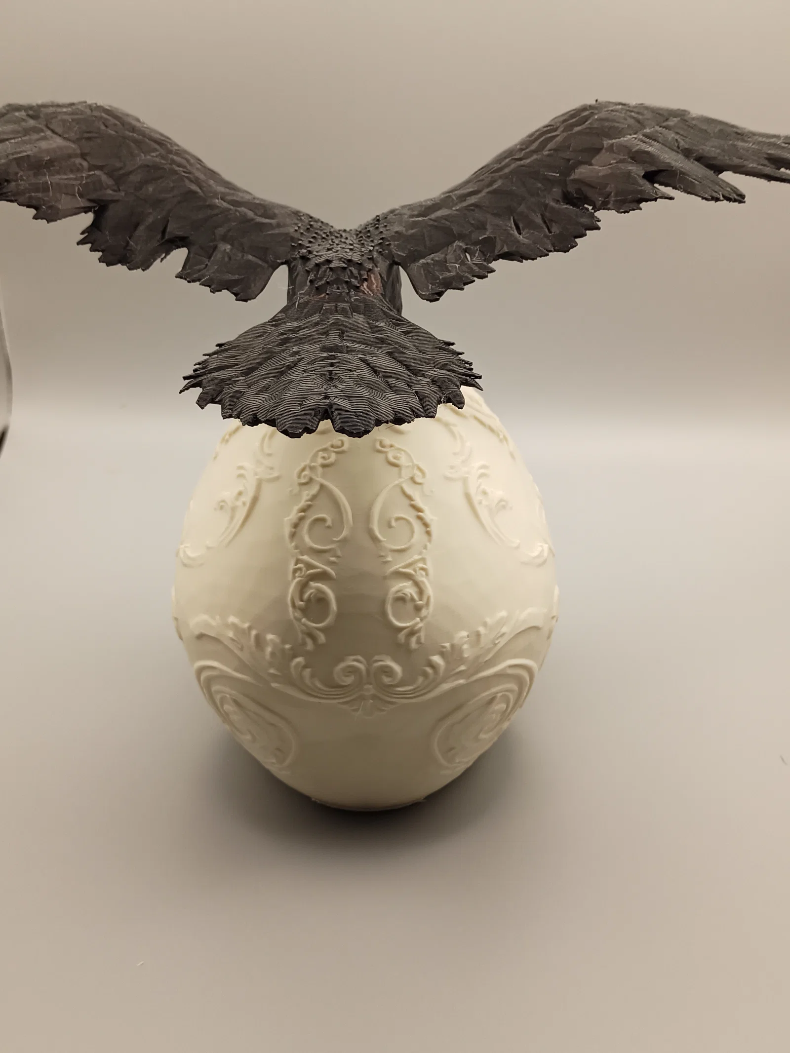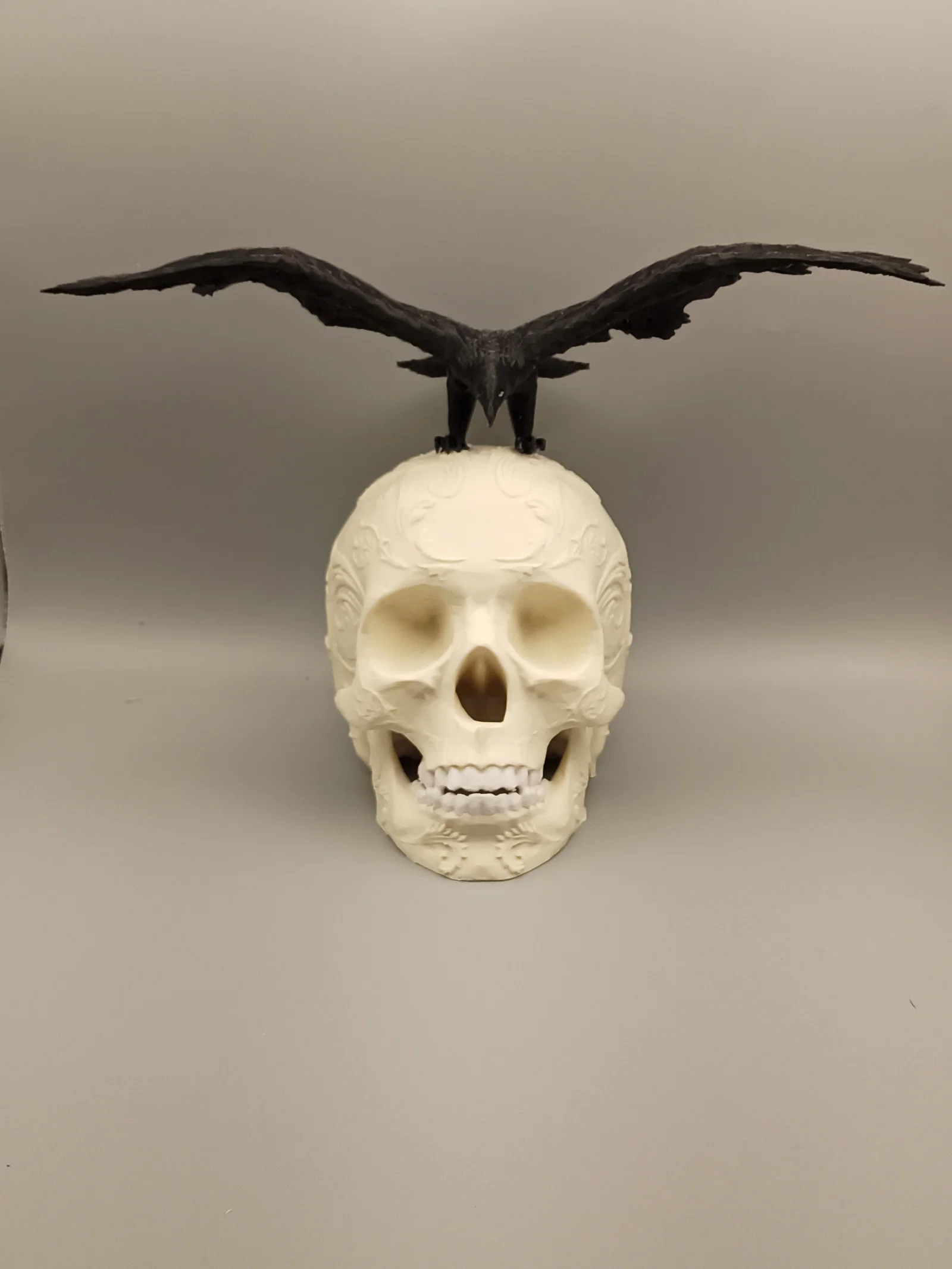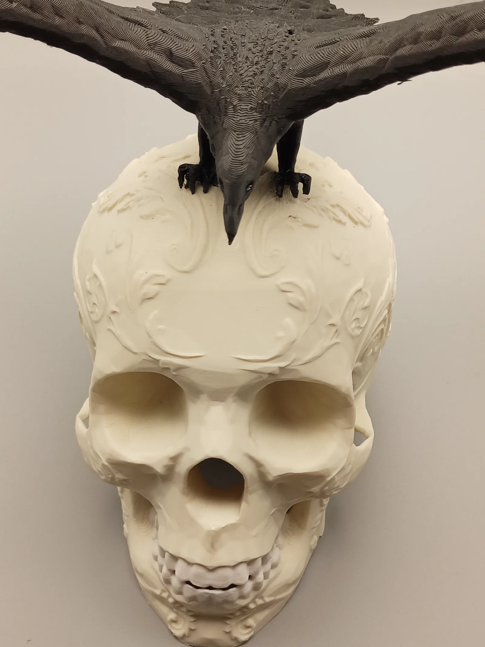 Một mẫu đầu lâu trang trí có con quạ dang cánh đậu trên đỉnh. In được một khối. Mẫu này cần có hỗ trợ khi in. Tác giả đã kết hợp nhiều mẫu có sẵn để tạo ra nó, in bằng máy Bambu Lab P1S với 4 màu nhựa PLA khác nhau.