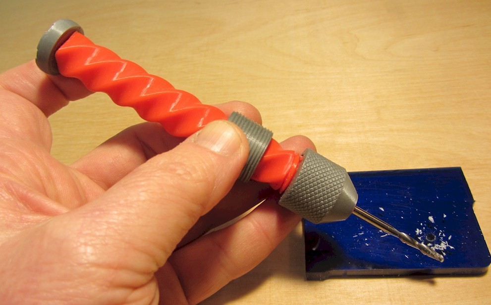 Phiên bản mũi khoan đẩy "bự" hơn với đầu kẹp có thể điều chỉnh cho mũi khoan 1.5-5mm, xoay 2 vòng mỗi lần kéo. Có thể dùng làm kìm giữ dũa. Hướng dẫn in và lắp ráp chi tiết.
