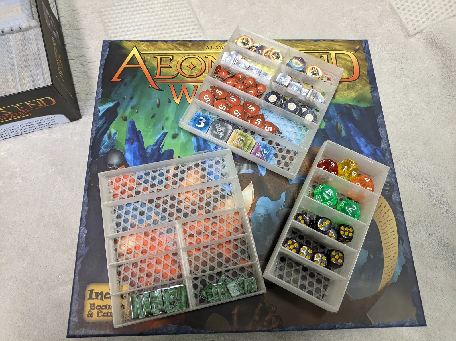 Tui đã tạo Insert cho Aeon's End / War Eternal / The New Age / Outcasts vì không tìm được cái ưng ý. Insert này có thể chứa 2 bản game chính trong 1 hộp với kích thước bên trong hộp 26.9x26.9 cm. Có 2 phiên bản V1 và V2 với các cách sắp xếp token và vật phẩm khác nhau, có hướng dẫn in và cài đặt chi tiết.