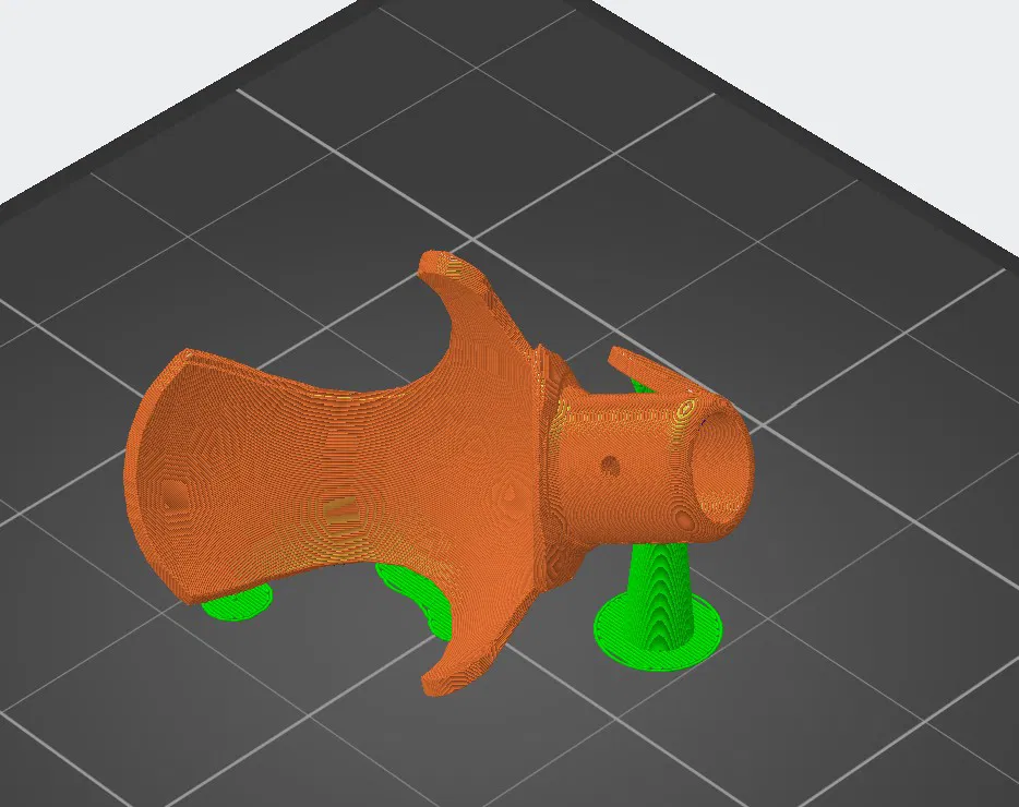 Đầu máy - Cái này phức tạp nhất. Xài PETG là tốt nhất. Tui dùng 4 lớp tường. Có cần hỗ trợ in. Hướng đặt tốt nhất như trong hình. Hỗ trợ ít thôi, có lẽ chỉ cần vành thôi là được, nhưng tui chưa thử.