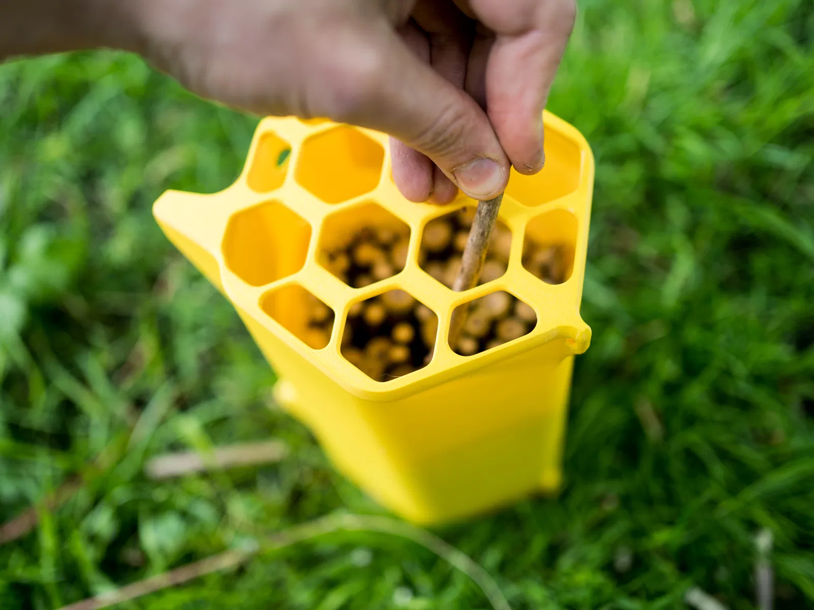 “Que tre hoặc thân cây sậy phù hợp nhất cho các tổ làm từ thân cây rỗng. Sau đó, côn trùng sẽ sử dụng chúng để đẻ trứng. Các thân cây nên được cắt ngắn còn mười đến mười lăm centimet. Tuy nhiên, đường kính có thể thay đổi. Để côn trùng chấp nhận các thân cây, một đầu phải được đóng lại bằng nút thắt thân cây hoặc bằng bông hữu cơ.”