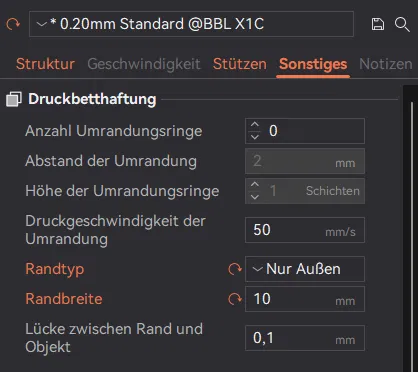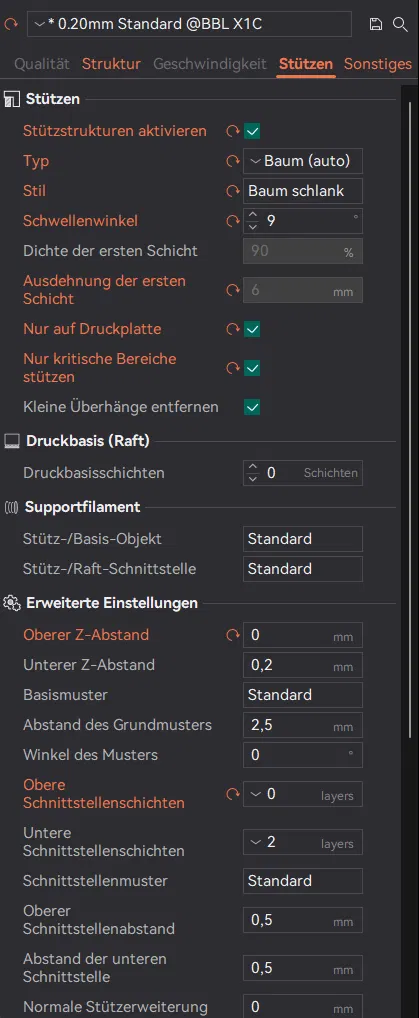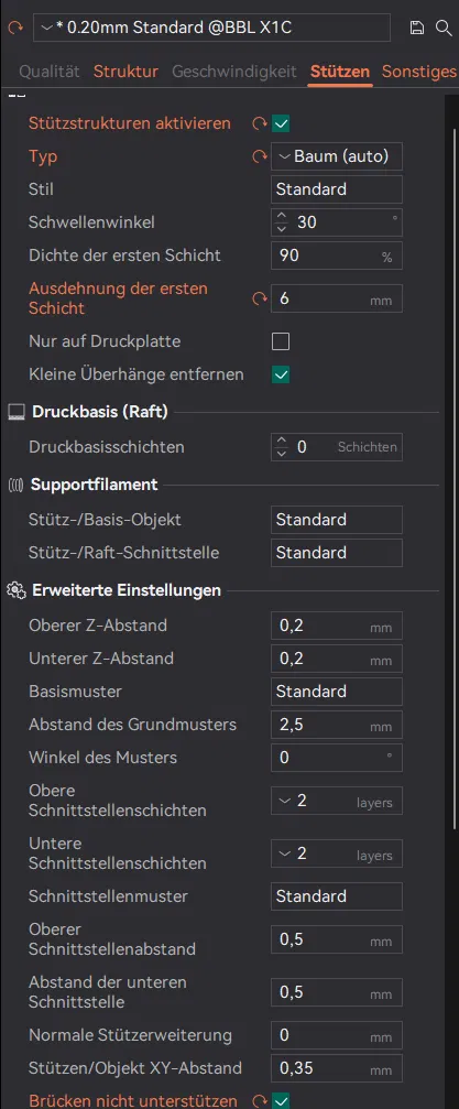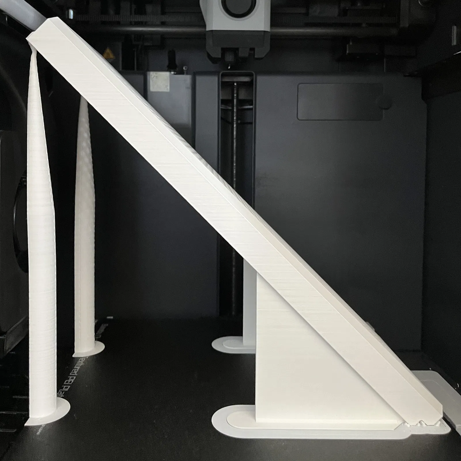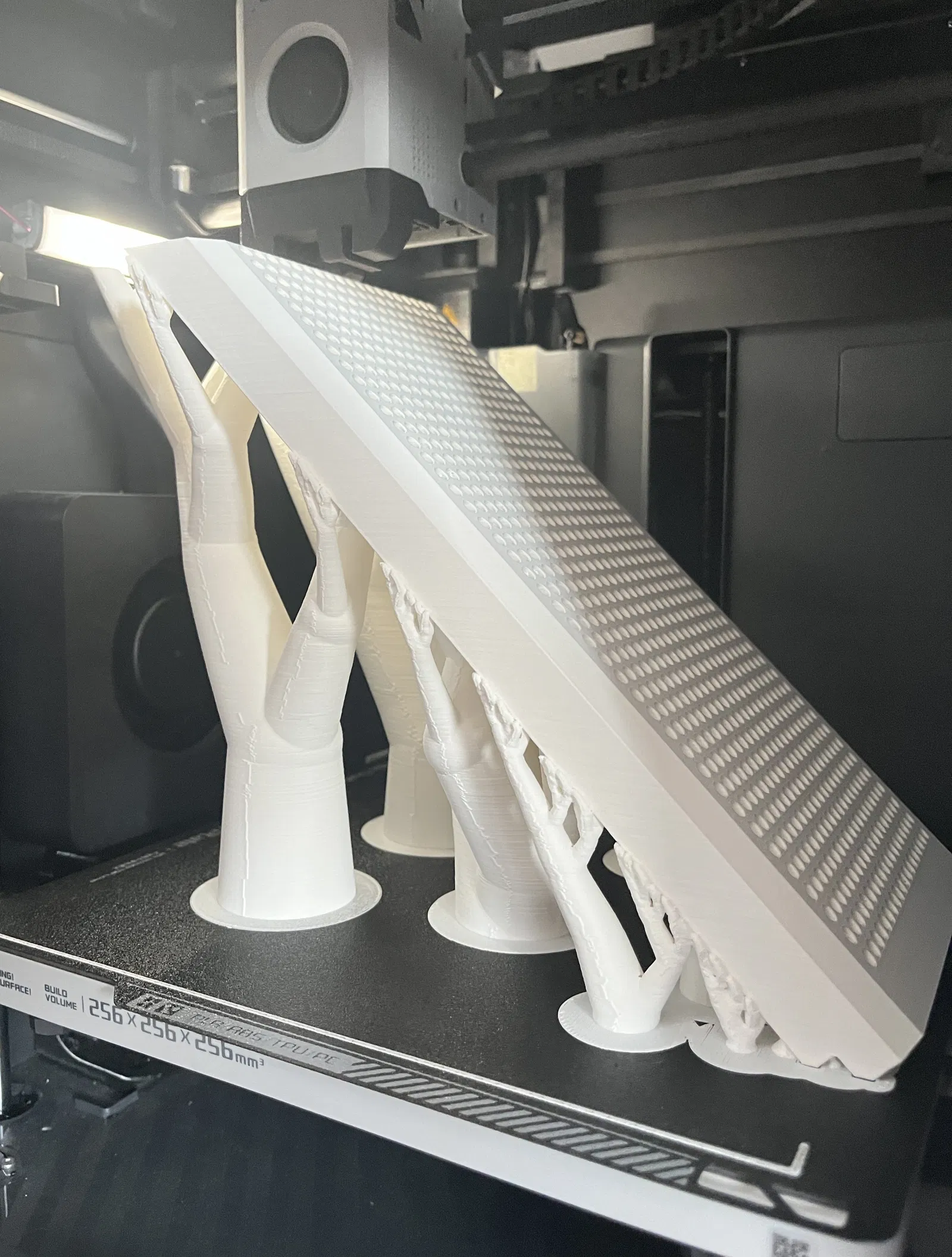 Ở đây bạn chỉ cần hai support cây nhỏ ở phía sau. Phần còn lại sẽ ổn với các support có sẵn. Chỉ cần đảm bảo bạn có đủ hệ thống làm mát. Dùng keo dán. Tôi đã dùng 3DLAC, nhưng bất kỳ loại keo nào cũng được. Đặt Aux-Fan thành 100% và để cửa với nắp mở trong khi in. Tốt nhất là giữ nhiệt độ phòng dưới 30°C.