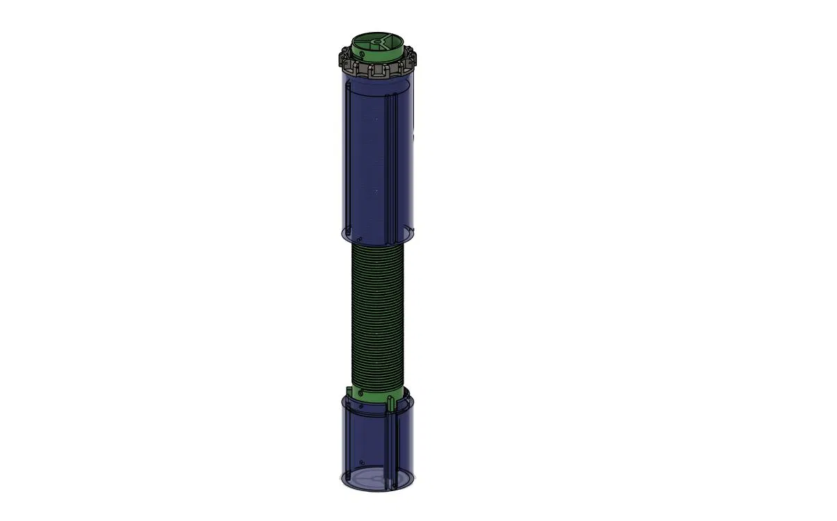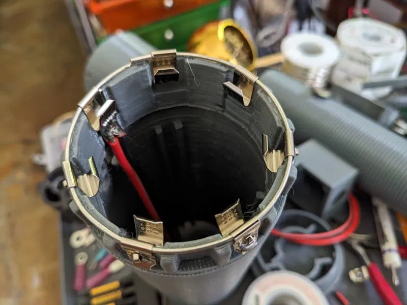 Việc thi công chủ yếu gồm các bộ phận của khuôn cuộn dây, nắp che và chân máy. Khuôn cuộn dây được in làm ba phần - trên, dưới và phần nối dài phía dưới. Khuôn cuộn dây dưới và phần nối dài có các cánh tản nhiệt để giữ cho nó ổn định khi di chuyển. Nắp che gồm các bộ phận trên, dưới và phần nối dài phía dưới.