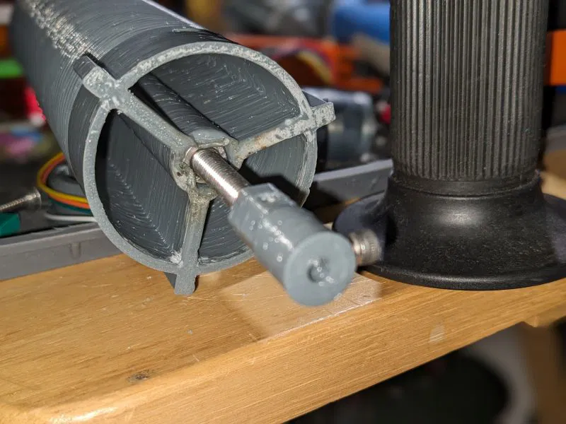 Việc lắp ráp cuối cùng nên được thực hiện khi cuộn dây được nâng lên đủ cao trên vít để dễ dàng tiếp cận khớp nối giữa trục motor và vít M6 trong quá trình gắn cuối cùng vào trục motor. Vặn thanh ren M6 vào khớp nối trước khi vặn vào đai ốc M6 đã nhúng trong cuộn dây. Khi gắn khớp nối vào trục motor, hãy chắc chắn siết chặt vít M3 để cố định khớp nối trên trục. Có thể dùng một giọt keo CA làm khóa ren cho chắc ăn. Một phương án thay thế cho khớp nối in 3D là dùng khớp nối trục bằng kim loại loại 4mm sang 6mm như cái này: https://www.amazon.com/uxcell-Coupling-L20xD12-Coupler-Connector/dp/B07P9693LZ