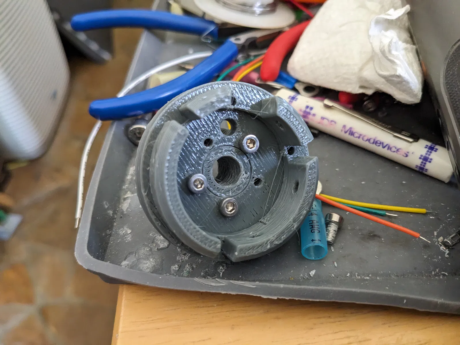 Các bộ phận của cuộn dây được ghép lại bằng keo CA lên các rãnh. Các bộ phận nắp che được lắp với nhau bằng vít M3. Đai ốc M6 đặt vào phần lõm ở khuôn cuộn dây dưới, sau đó cố định bằng cách hơ nóng cạnh phần lõm và gấp các tab lại đè lên đai ốc.