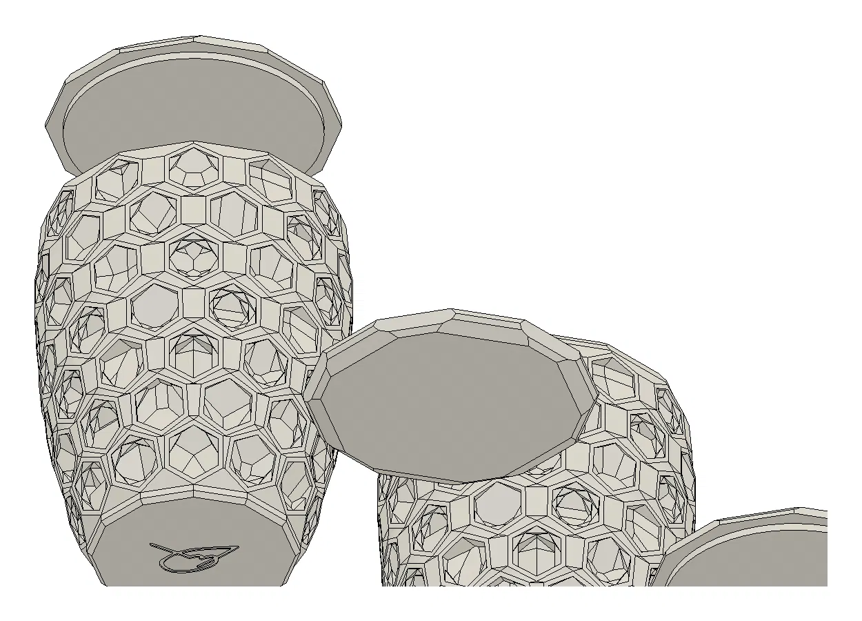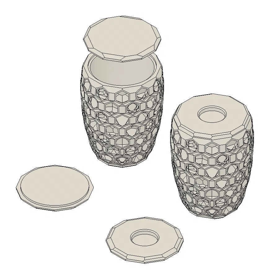 Khám phá bình đựng tro cốt có thể tùy chỉnh, được thiết kế với họa tiết "DecoHex" độc đáo và cấu trúc hai lớp vỏ. Thiết kế tham số cho phép bạn thay đổi kích thước dễ dàng để chứa lượng tro cốt khác nhau, với các tùy chọn nắp và chân đa dạng. Hoàn hảo cho vật dụng cá nhân hoặc nến.