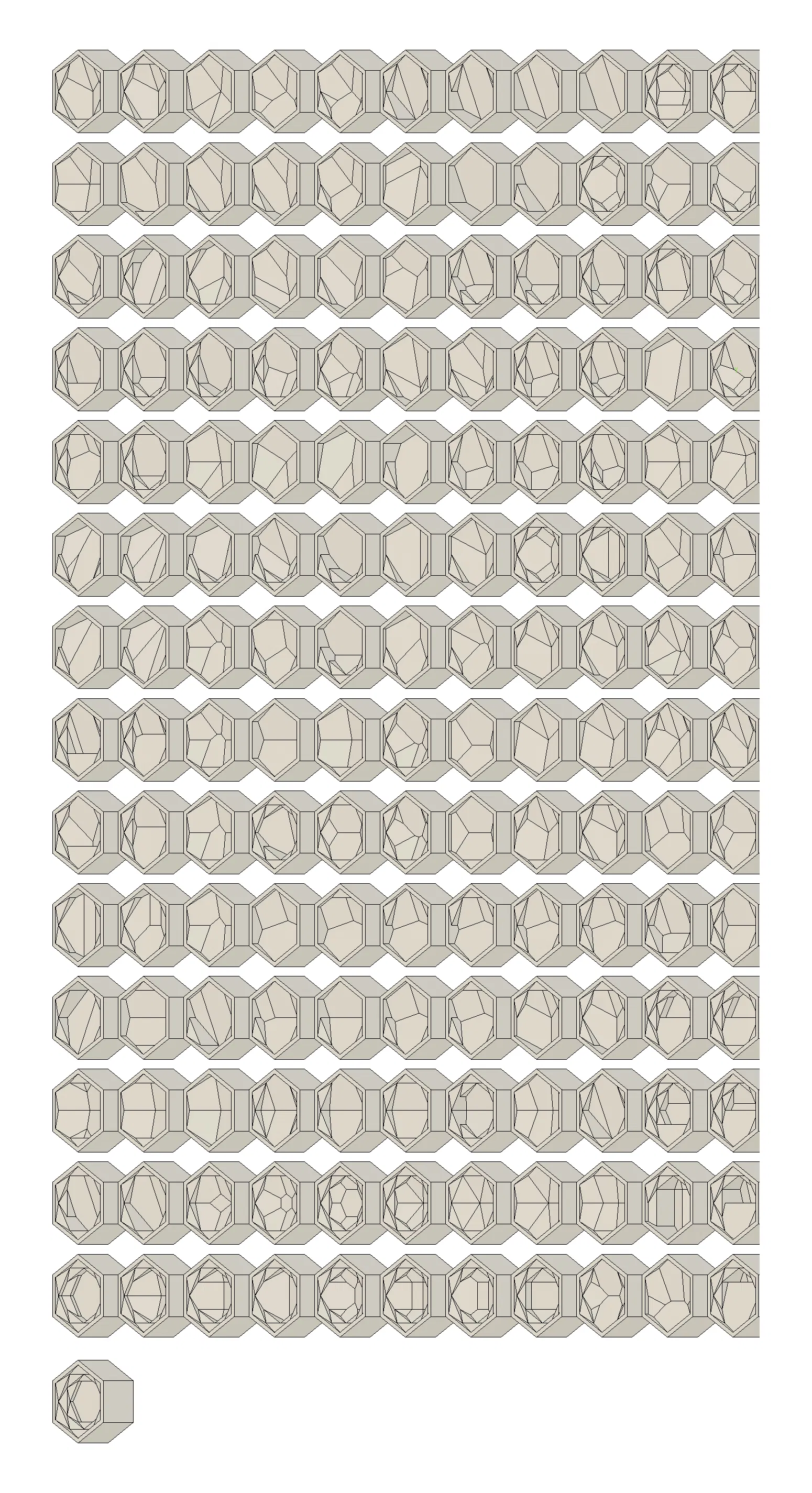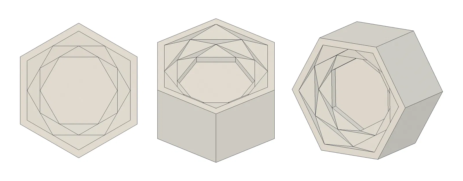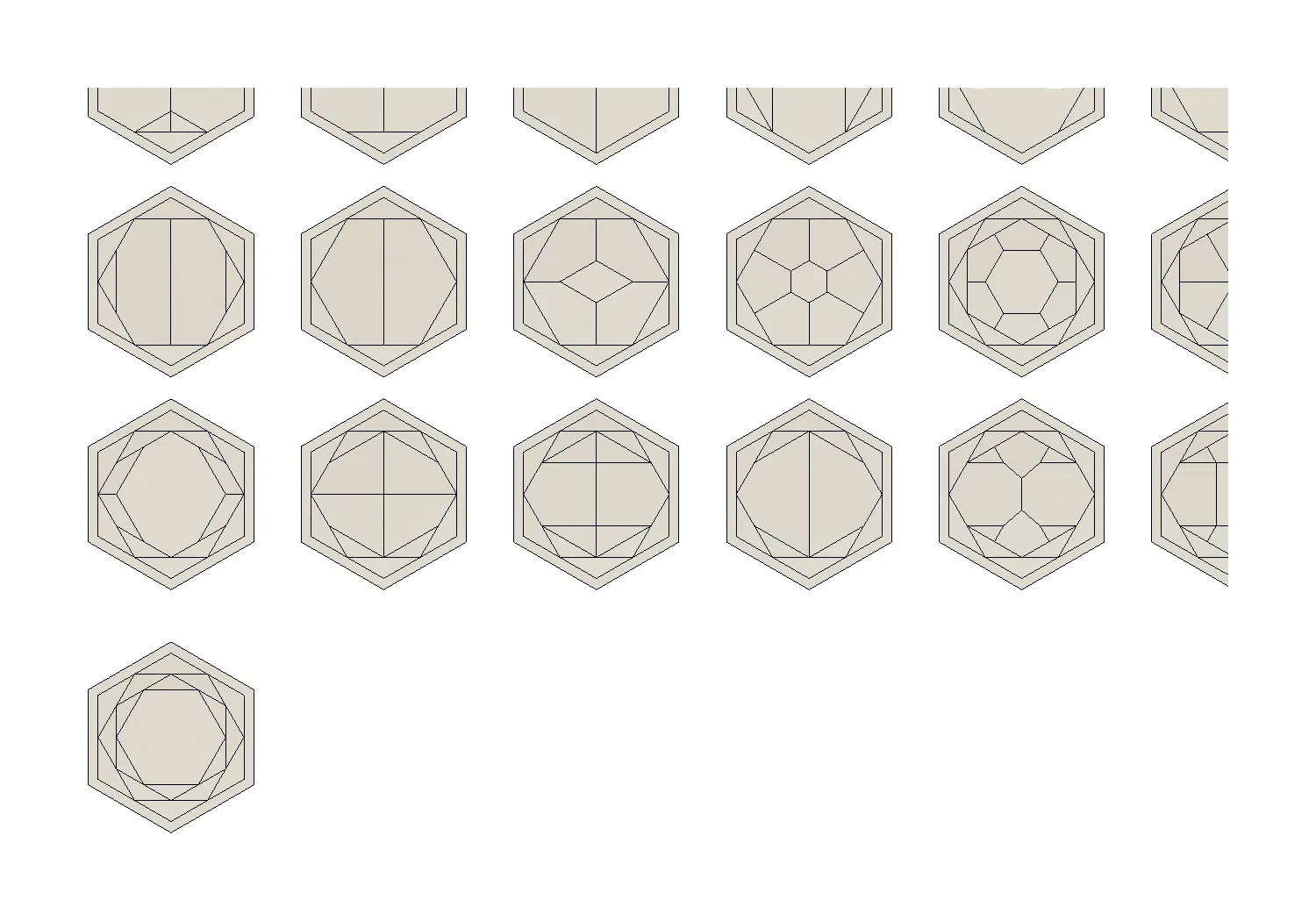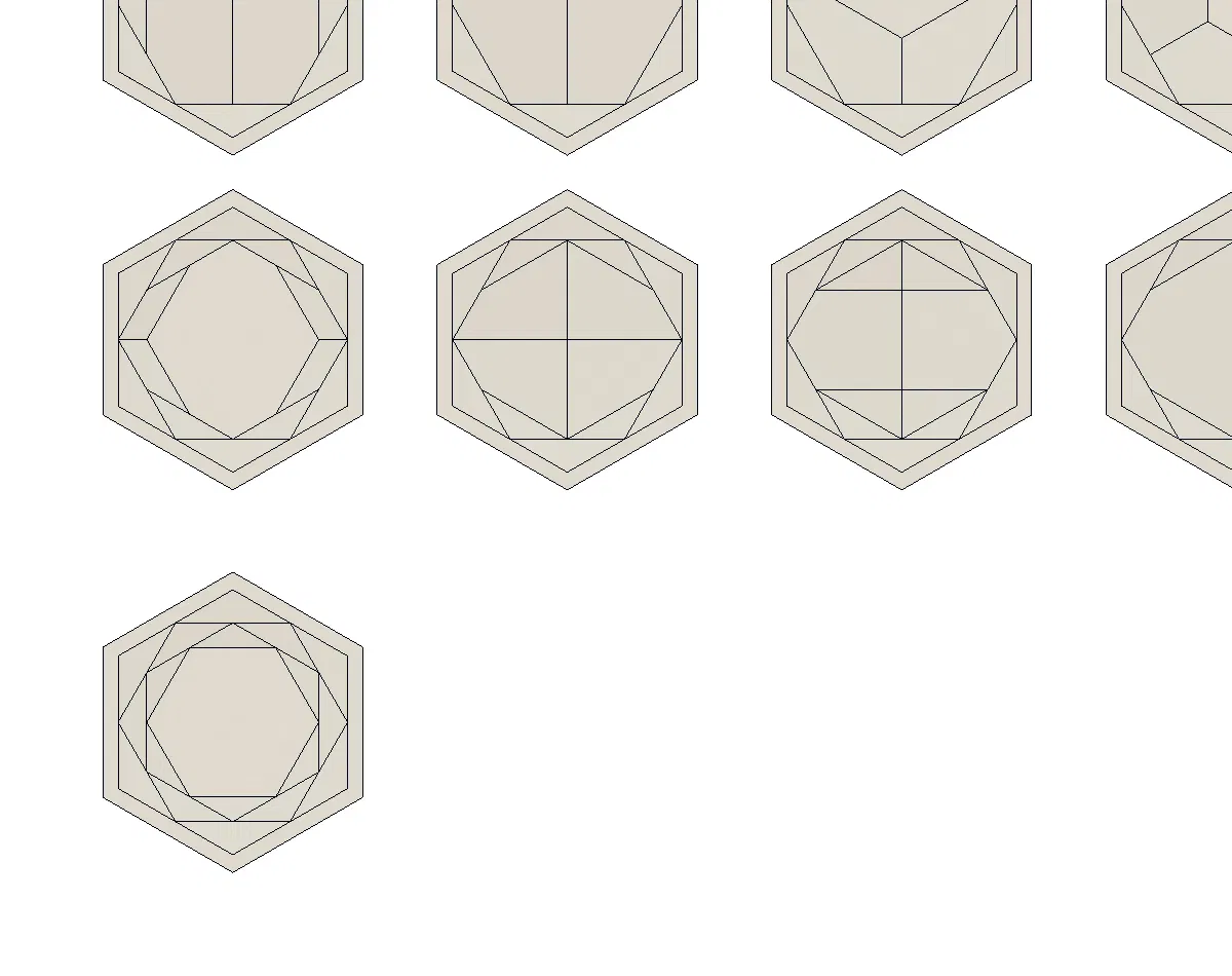 Các họa tiết hình lục giác dựa trên một hình dạng được định nghĩa theo toán học mà tôi đặt tên là "DecoHex". Bằng cách loại bỏ các mặt phẳng trong DecoHex cơ bản, tôi đã tạo ra hơn 235 biến thể áp dụng cho bình hoa, bình chứa, bát và cho một bình đựng tro cốt.