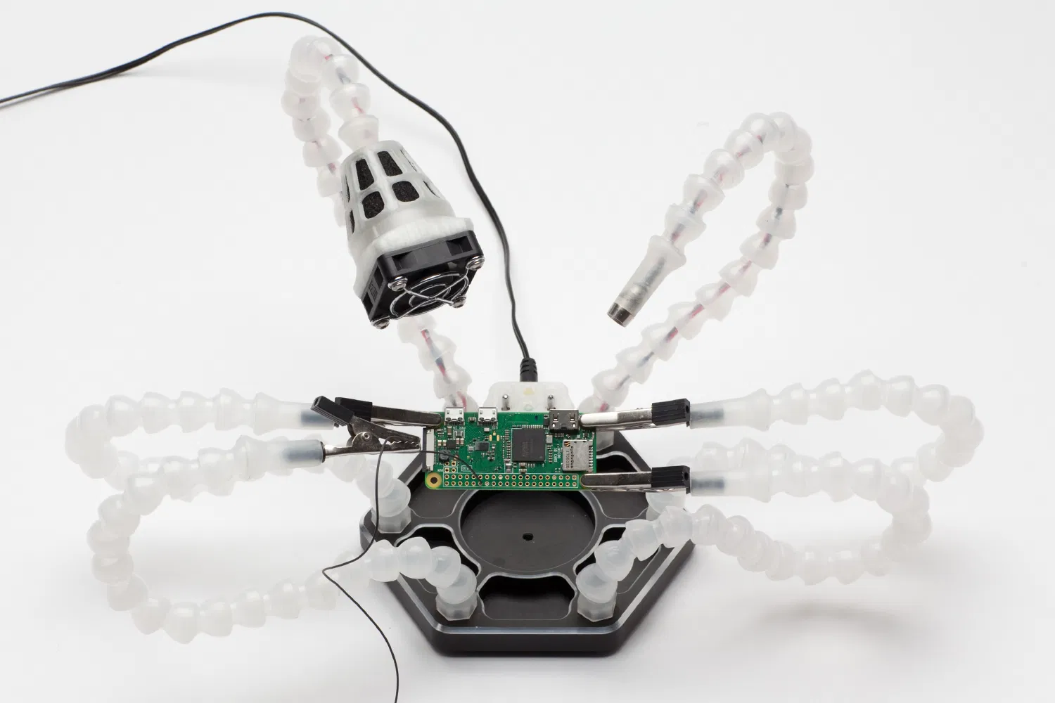 Thông thường, các bộ kit này là một mớ hỗn độn các bộ phận. Phần đế bằng nhôm và các cánh tay linh hoạt được bán trực tuyến. May mắn thay, tôi đã tìm thấy một phiên bản đen trắng trên AliExpress không có quạt và đèn.