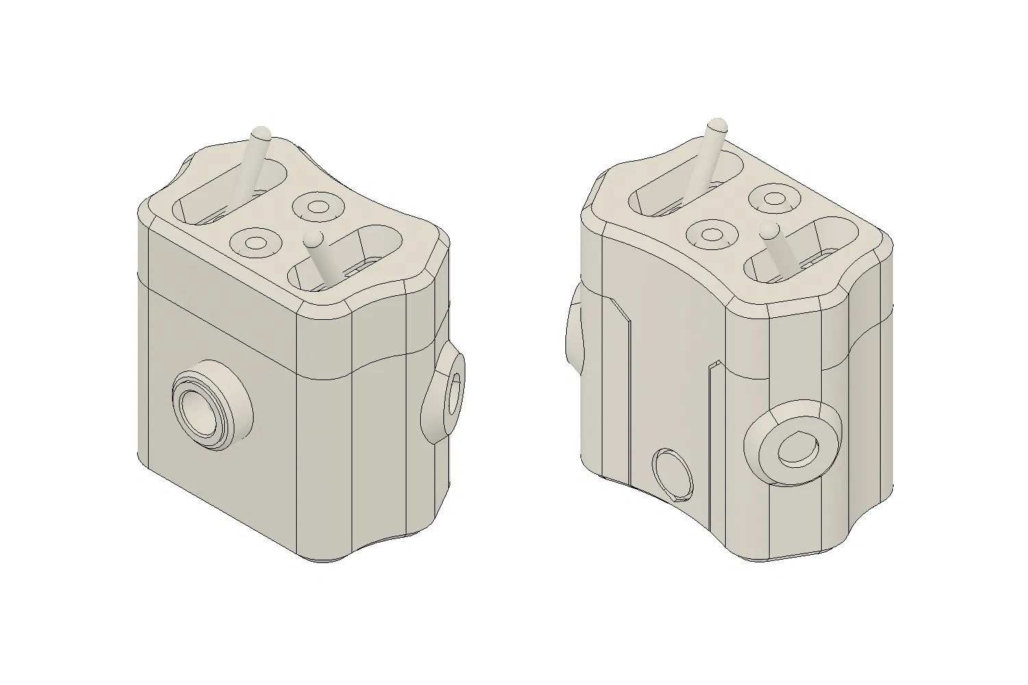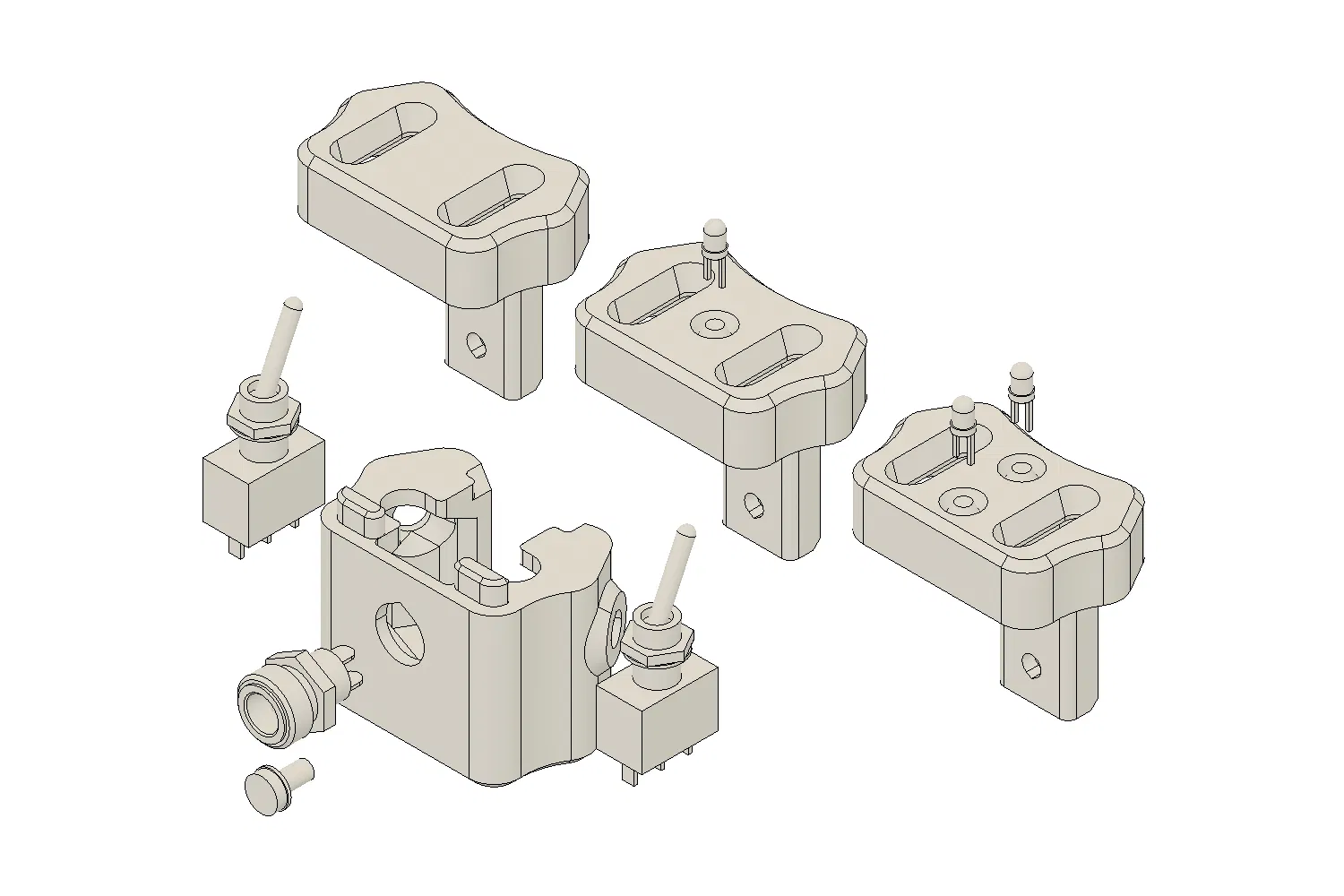 - Hai công tắc gạt cơ bản, một cho quạt, một cho đèn. Kích thước thân tối đa: rộng 15mm, sâu 8mm và cao 15mm. Bán kính lỗ xuyên là Ø6mm. Loại cực đơn hoặc cực kép đều được.