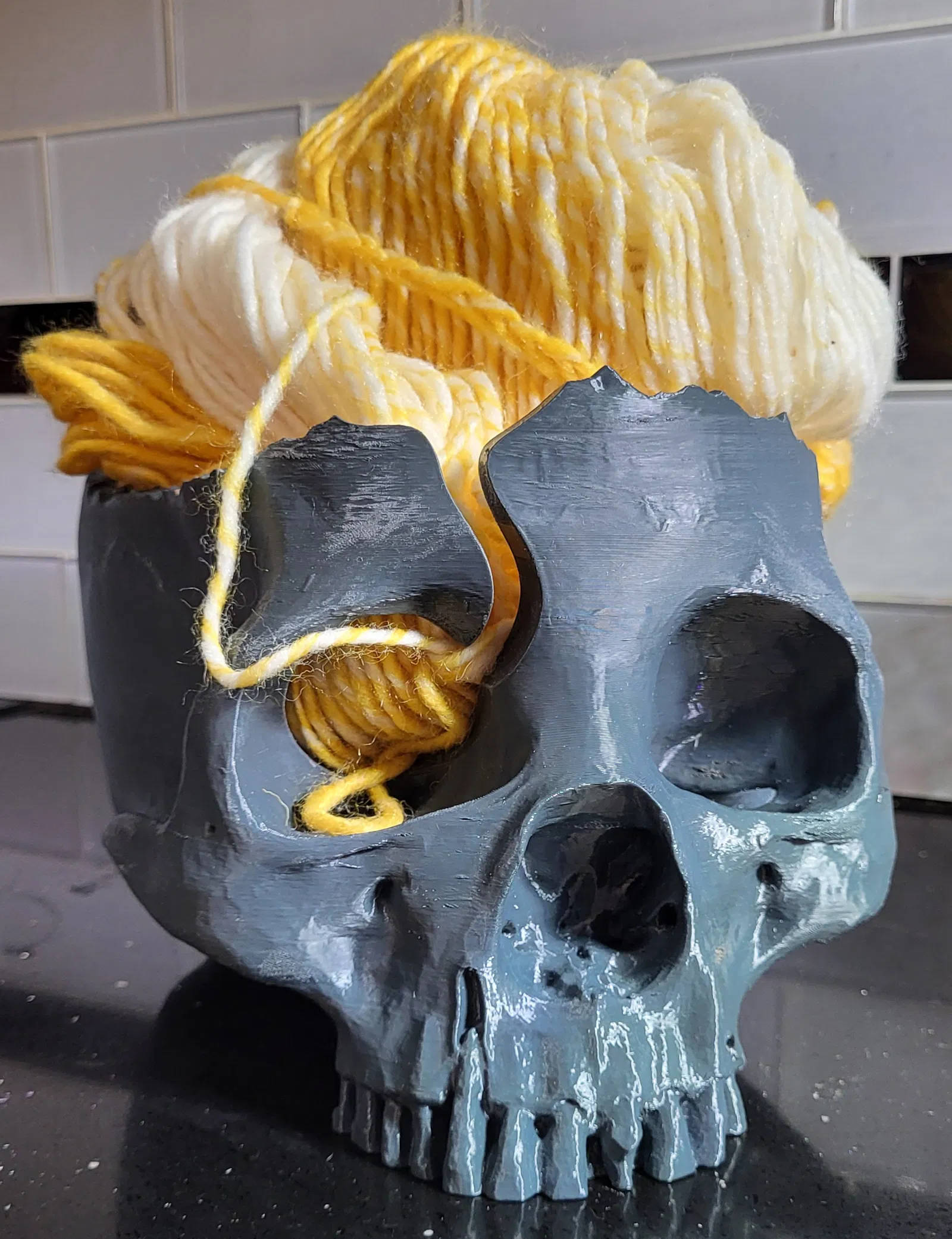 Chiếc tô đựng len hình đầu lâu độc đáo này sẽ giúp bạn giữ cho cuộn len gọn gàng khi đan hoặc móc. Kích thước lớn hơn bình thường, đủ chỗ cho cả những cuộn len to nhất. In bằng PETG cho độ bền cao, thời gian in khoảng 20 tiếng. Link tải STL gốc từ Thingiverse.