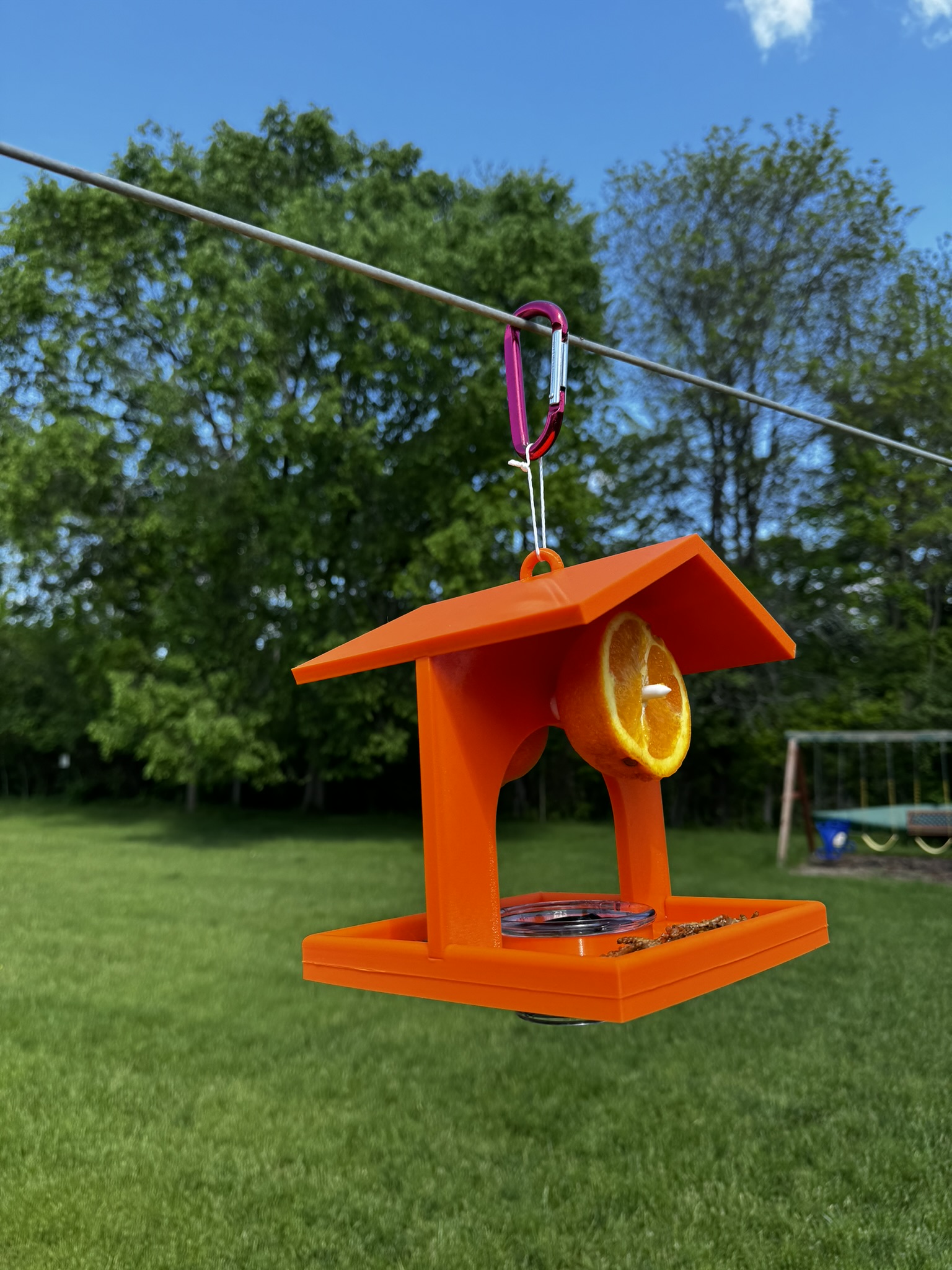Mẫu cho chim Oriole này được thiết kế để dùng chung với chén nhỏ hoặc dùng hạt, mứt, sâu bột. Có đế và mái riêng biệt, dễ in ấn. Bạn có thể dùng chén có lỗ thoát nước hoặc chén liền đáy tùy nhu cầu.