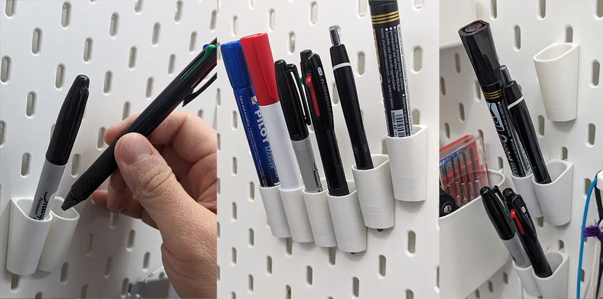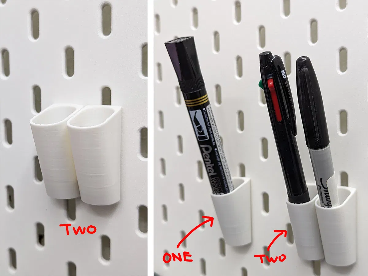 Giá đỡ bút nhỏ gọn cho bảng IKEA Skadis, đựng được 2 cây bút có đường kính tối đa 1.5cm. Giá đỡ này chiếm 3 lỗ trên 2 cột dọc, có thể móc thêm giá đỡ khác bên cạnh và đặt bút nghiêng để dễ lấy, tiết kiệm thời gian tìm kiếm.