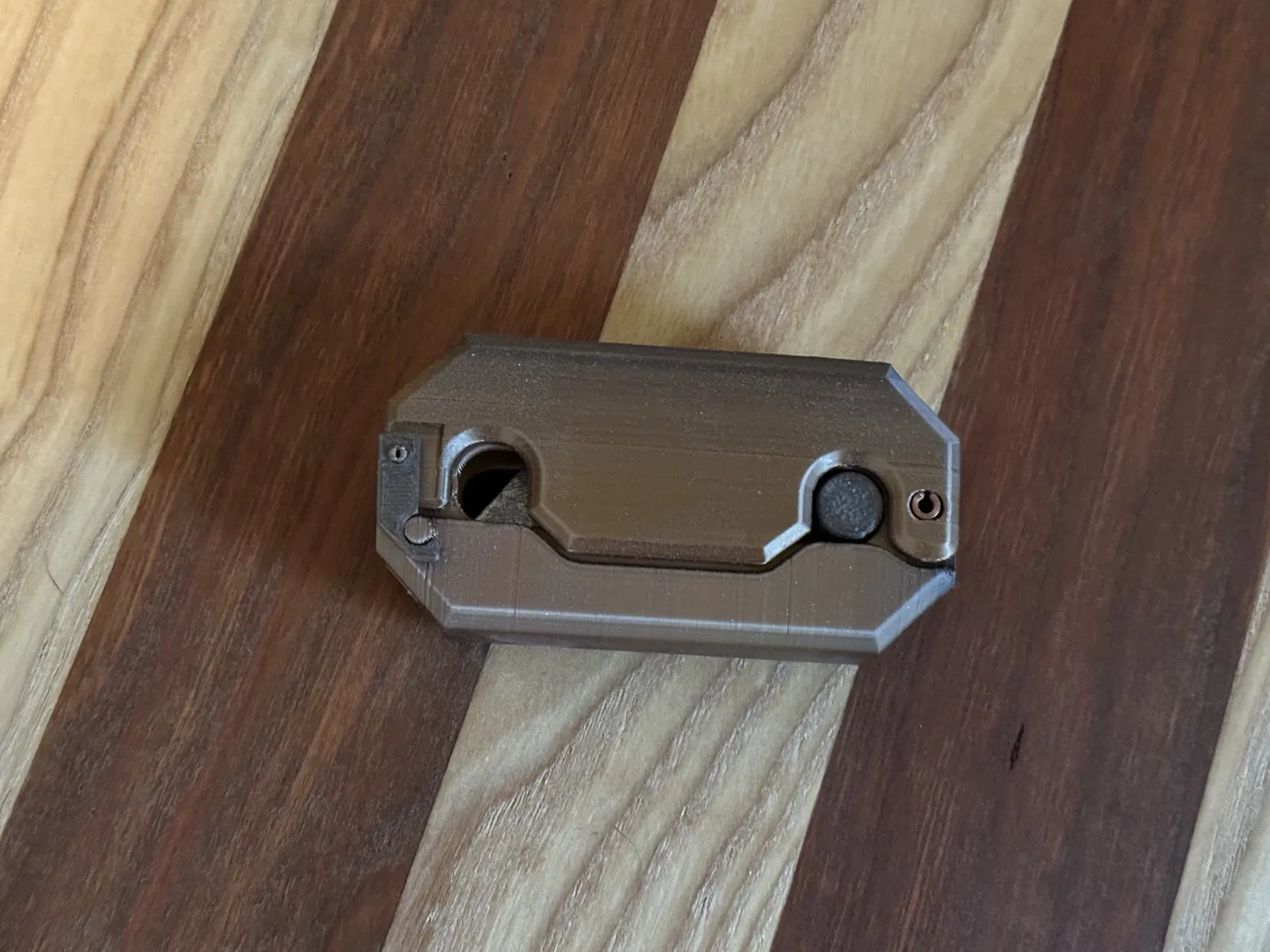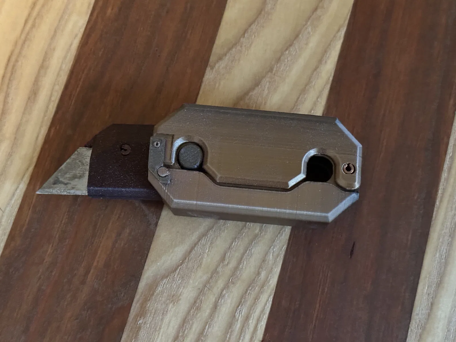 Sau vài góp ý, các chốt giữ và khe cắm lưỡi dao đã được chỉnh sửa. Bây giờ lưỡi dao trượt vào êm ru và chốt giữ cũng khớp lại với nhau chắc chắn, nhưng không quá chặt đến mức không thể tháo ra.