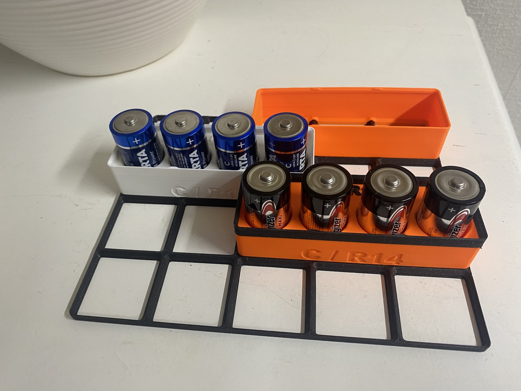 Hộp đựng pin Gridfinity cho pin C-/R14-. Hộp có thể xếp chồng lên nhau bằng cách sử dụng miếng đệm đi kèm.