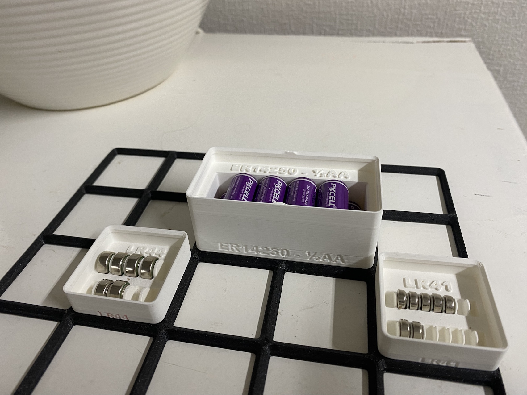 Kệ Gridfinity 1x2x5 chứa 10 pin ER14250 (size AA một nửa) và kệ 1x1x2 chứa pin cúc áo LR41, LR44. Hộp được tạo bằng Fusion 360 GridfinityGenerator.