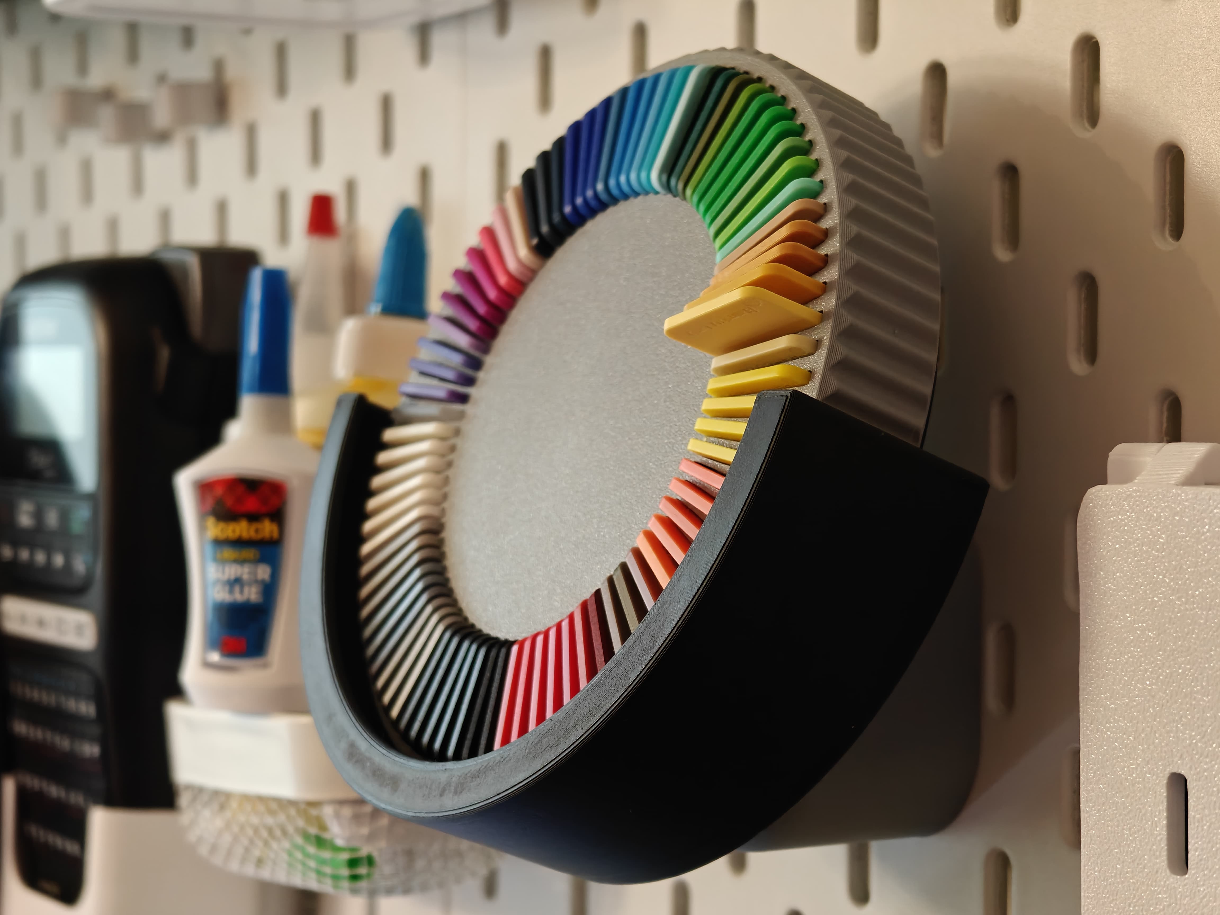 Sau một thời gian dài, trải qua vài trận chiến và những lúc nghỉ ngơi, tôi lại quay lại rồi đây, suy nghĩ xem làm sao để cái góc làm việc của mình nó gọn gàng hơn một chút. Cái Filament Swatch Display của anh @Brad - FTBT 3D, tôi tự nhủ làm sao để treo cái món đồ tuyệt vời này lên cái bảng Skadis của Ikea nhỉ..