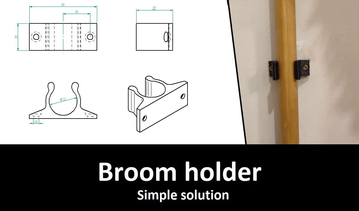 Đây là một cái kẹp chổi siêu đơn giản, dùng cho cán chổi khoảng D22 nè. Nó được thiết kế để treo tường đó. Tui có xài nhựa PETG.