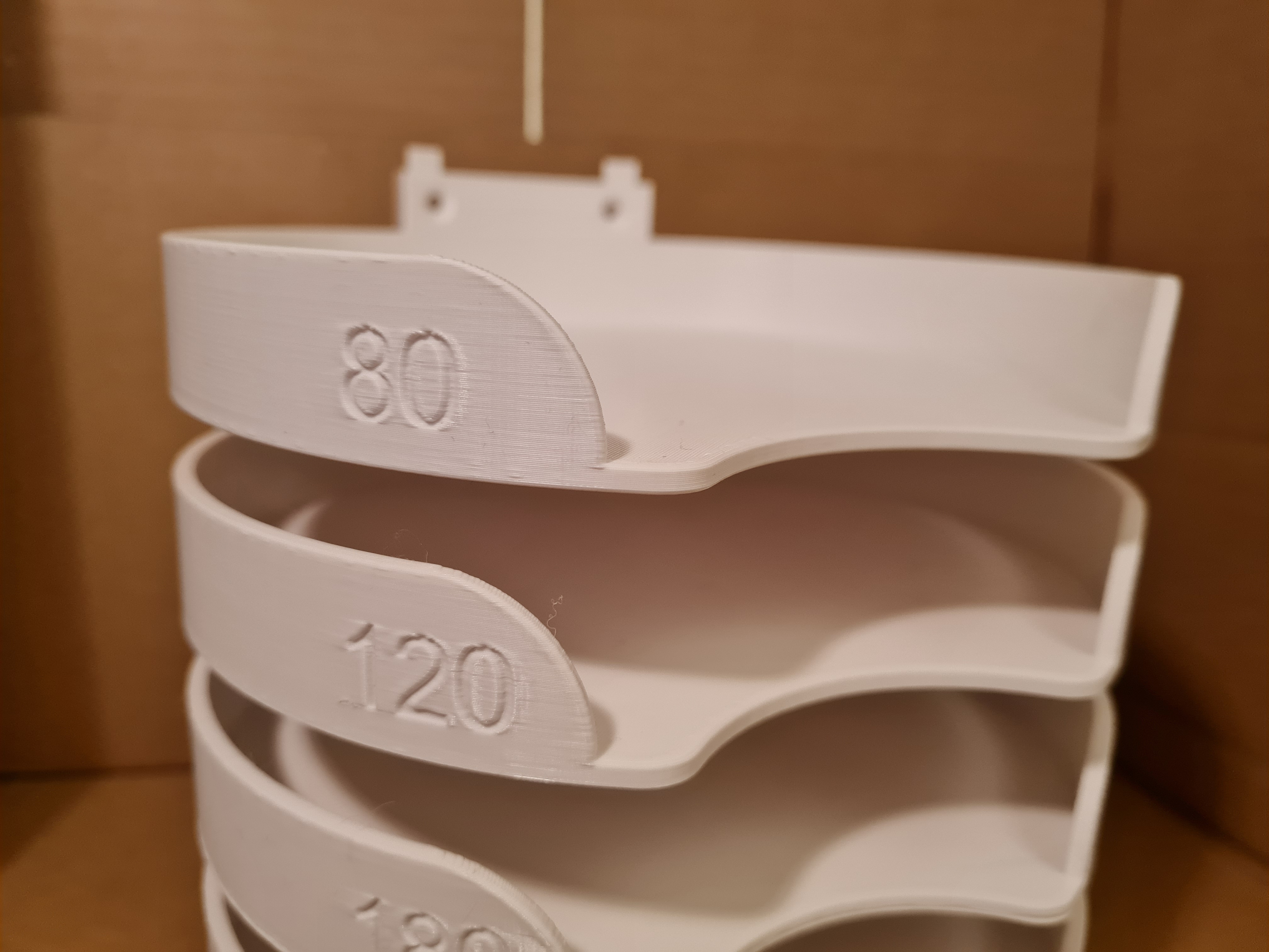 Đây là giải pháp lưu trữ cho đĩa chà nhám có đường kính 125 hoặc 150 mm. Chúng có thể được xếp chồng lên nhau bằng hệ thống kết nối tích hợp và chúng giữ với nhau ngay cả khi không bắt vít vào tường hoặc gỗ. Tuy nhiên, đối với hơn 5 cái, bạn nên bắt vít chúng vào một cái gì đó. Cập nhật: Tôi đã thêm phiên bản extit{ extit{tall}}, có thể được sử dụng trong trường hợp bạn đang sử dụng các gói 50 tờ. Chúng cung cấp chiều cao gần 70 mm cho các tờ giấy của bạn. Tôi bắt đầu với 150 mm dạng tổ ong và sẽ sớm mở rộng. Một vài nhận xét: * Đối với các loại giấy nhám khác nhau, tôi đã tạo các rãnh có số grit tương ứng để dễ nhận biết. Hiện tại chúng đạt từ 40 đến 3000. Nếu bạn cần văn bản khác, vui lòng viết bình luận.