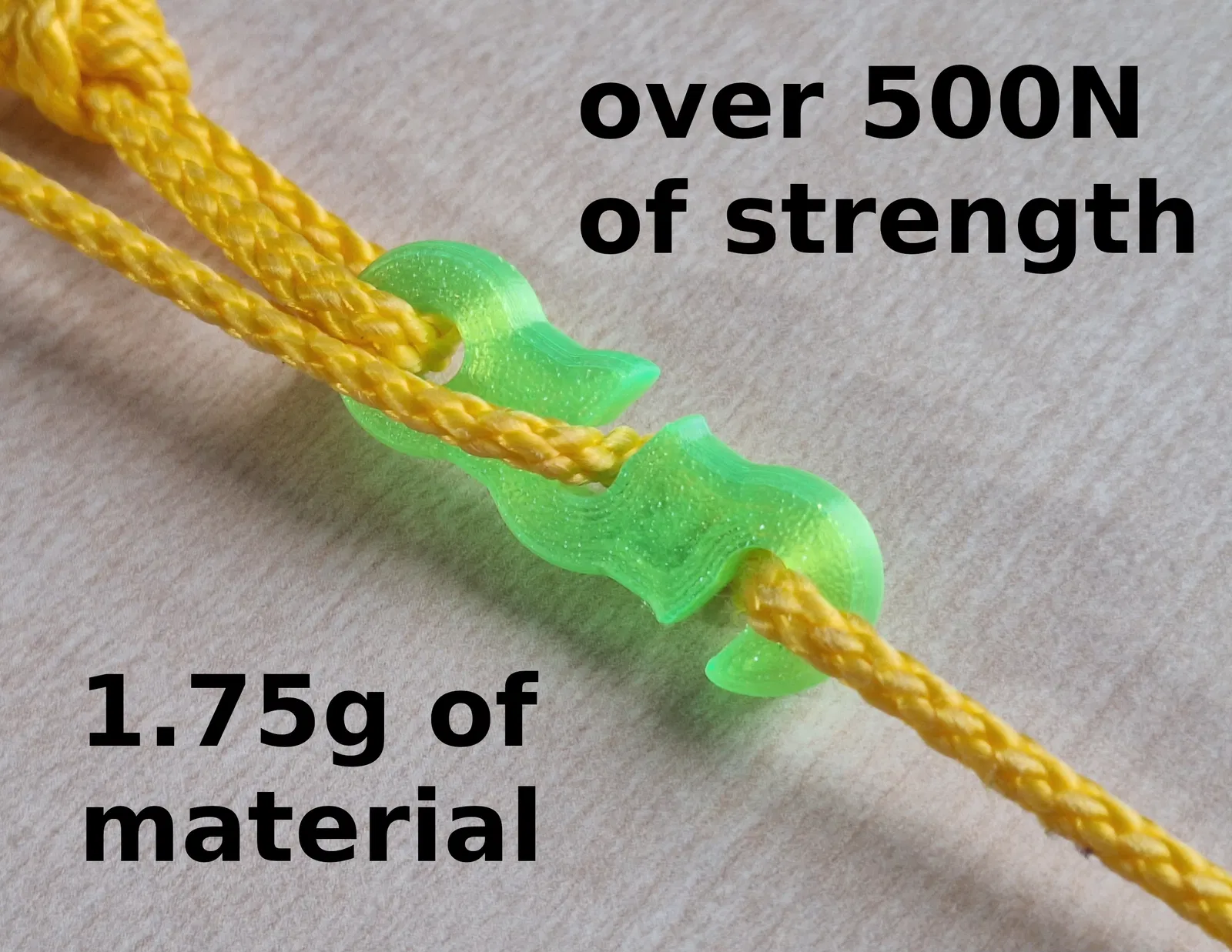 Bất chấp kích thước nhỏ bé của nó, mỗi bộ căng dây có thể chịu được lực kéo hơn 50kg (500N) khi được sử dụng với dây paracord 3mm (không thử nghiệm với các loại dây khác). Lực này lớn hơn nhiều so với những gì bạn có thể đạt được bằng tay và lớn hơn nhiều so với dây lều của bạn có thể chịu được. Nhưng ngay cả khi bộ căng dây (làm bằng PETG) bị biến dạng, ở mức khoảng 600N, nó sẽ không bị gãy mà chỉ bị uốn cong, để dây có thể trượt ra khỏi móc dưới và sau đó là móc giữa. Bộ phận có thể bị biến dạng nhẹ, nhưng vẫn có thể sử dụng được sau đó (điều này có thể quan trọng nếu bạn ở nơi hoang dã và không có bộ phận thay thế).