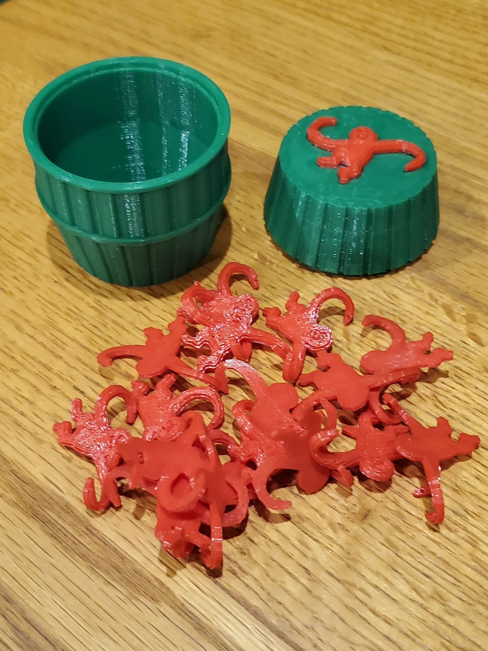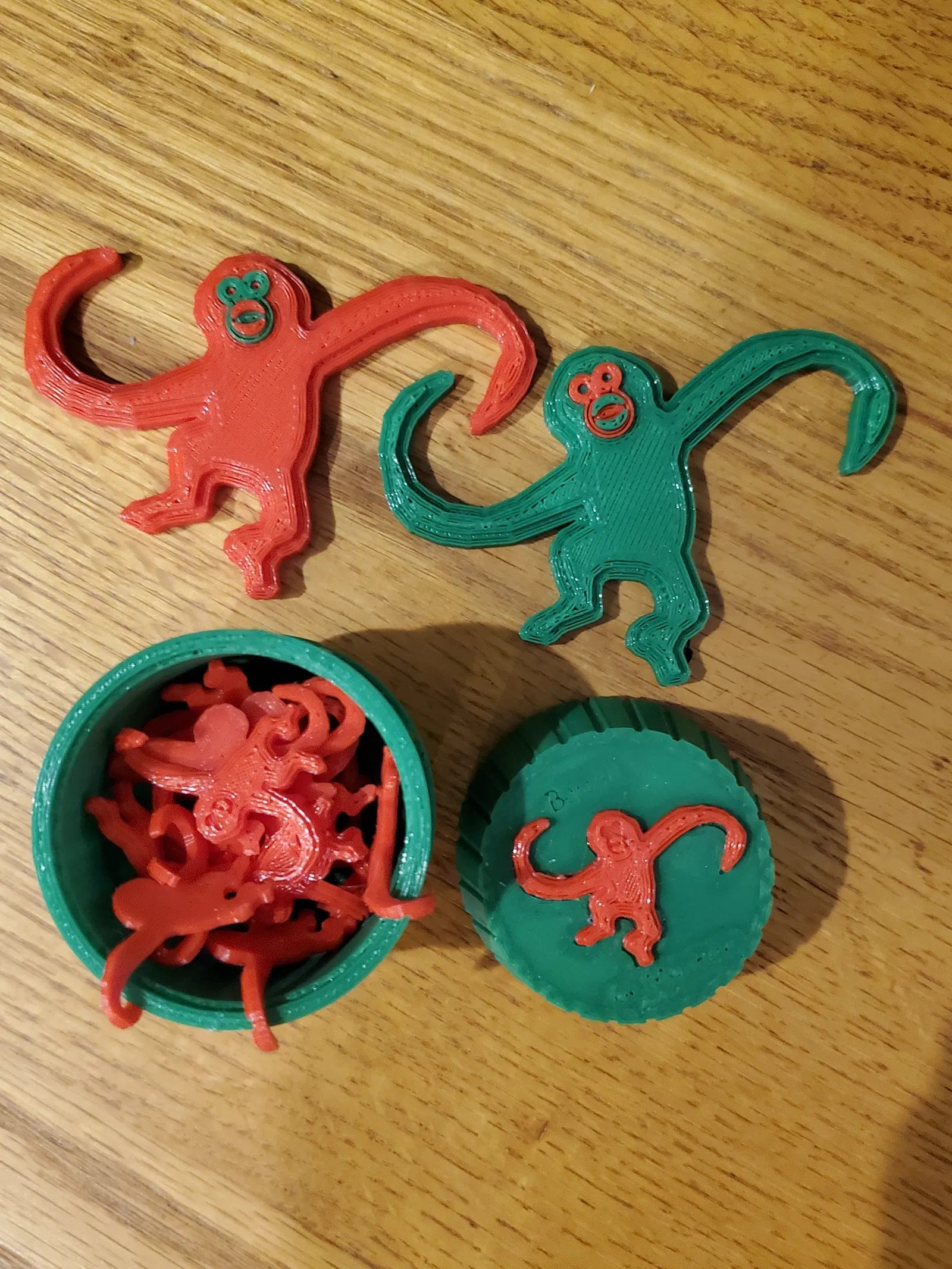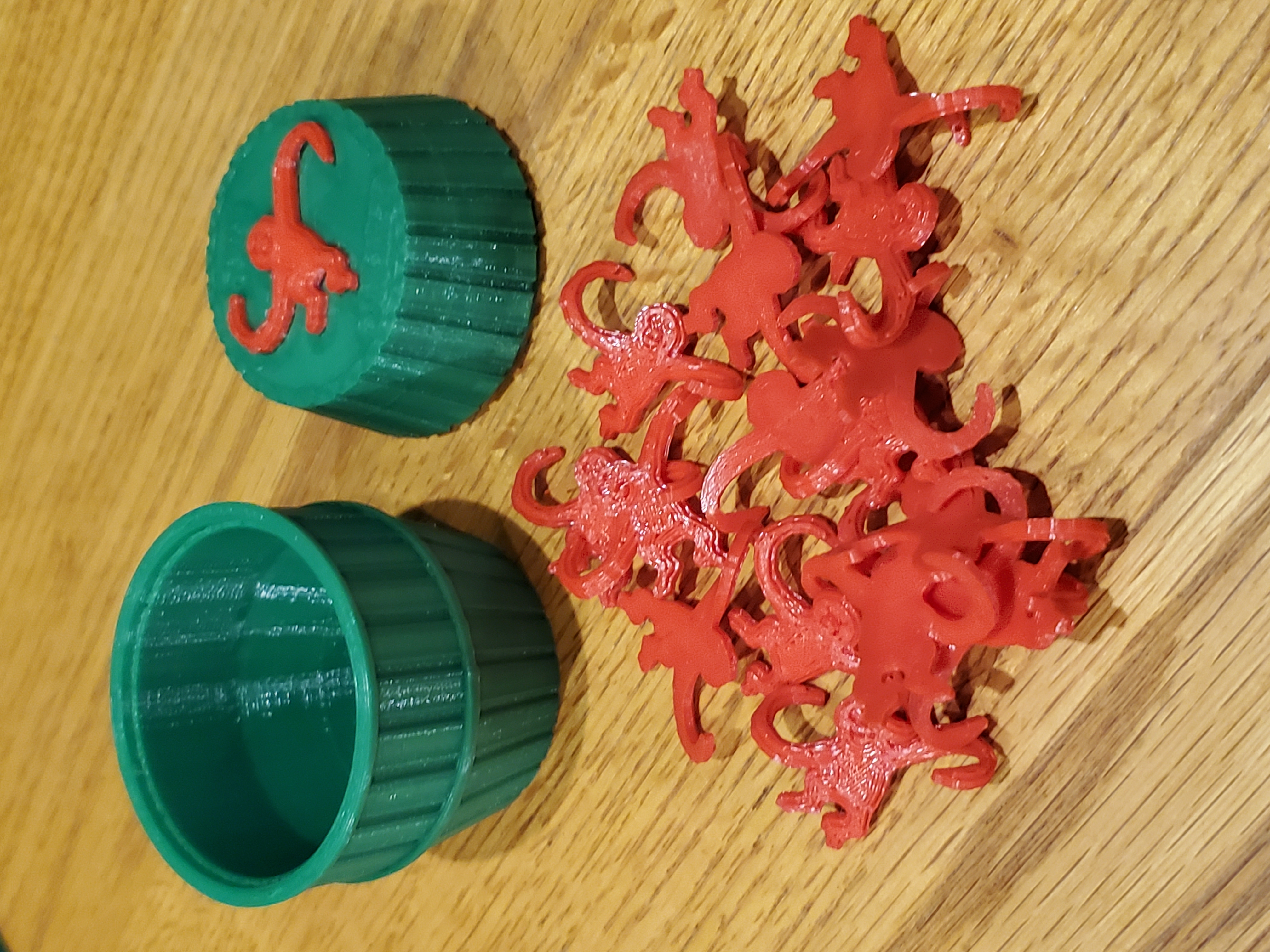 Trò chơi kinh điển này khó hơn bạn nghĩ. Cái thùng và những chú khỉ có thể được in với nhiều kích cỡ khác nhau. Hướng dẫn hậu xử lý để tăng cường khả năng móc nối. Xem file PDF đính kèm trong "other files".
