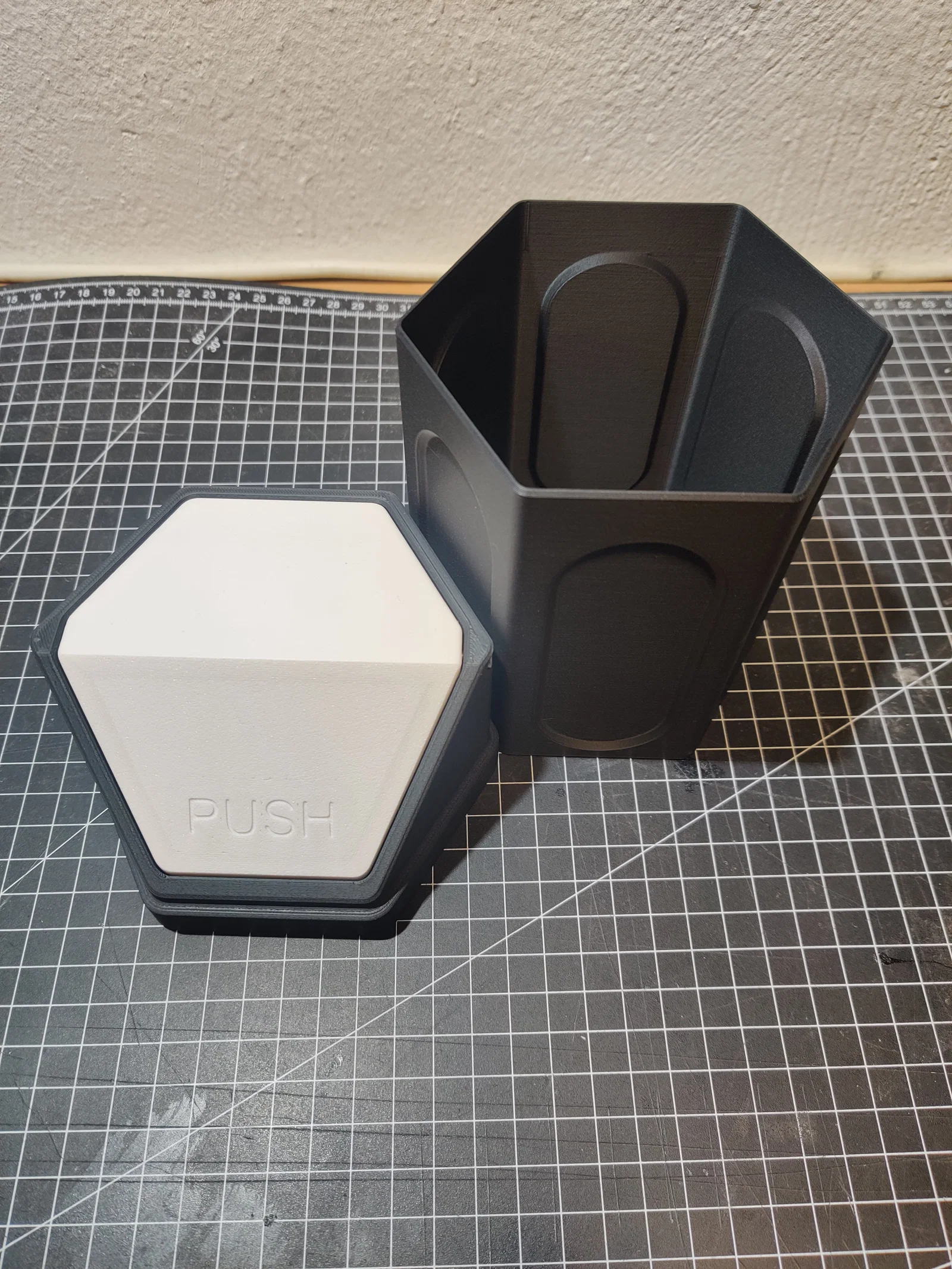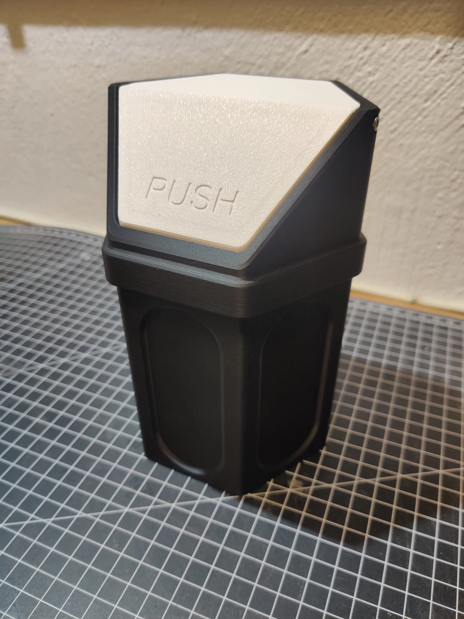 Mẫu thùng rác hình lục giác đơn giản với nắp đậy. Dễ in, không cần vật liệu hỗ trợ. Cần 2 ốc M3 để lắp. Lưu ý cách in nắp để đậy kín đáo. Kích thước: cao 175mm, đường kính 100mm.