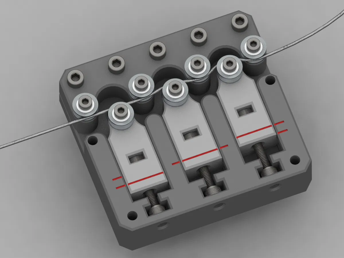 Cái tool này giúp làm thẳng dây bị quấn thành cuộn. Có thể gắn hai bộ vuông góc để xử lý dây cong phức tạp. Thích hợp cho dây nhạc 0.06” và nhiều kích cỡ dây khác. Cần 7 V624 bearing mỗi bộ.