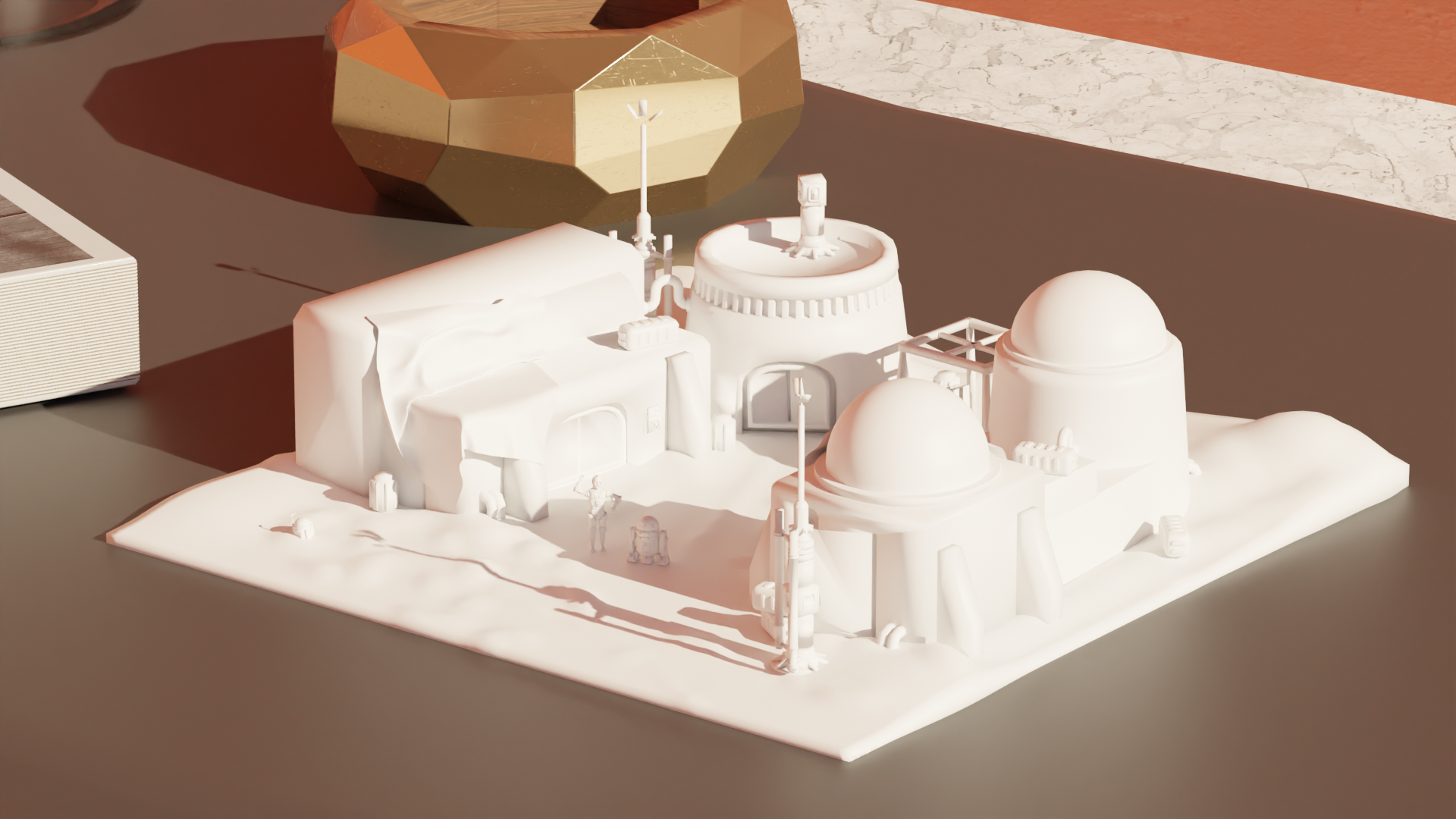 Bộ mô hình trang trí nhà cửa Star Wars với C3-PO, R2-D2 và cảnh Tatooine. Thích hợp để trưng bày, tạo điểm nhấn cho không gian sống của fan. Có thể tùy chỉnh kích thước theo ý muốn.