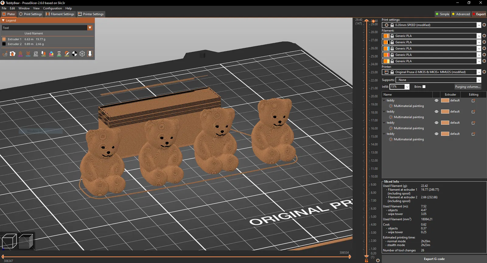 File 3mf là một khay gồm bốn con ở độ dày lớp .2 với 26 lần thay đổi màu. Màu nâu ở khe trục cuốn đầu tiên và màu đen ở khe thứ hai cho mắt, mũi và miệng.