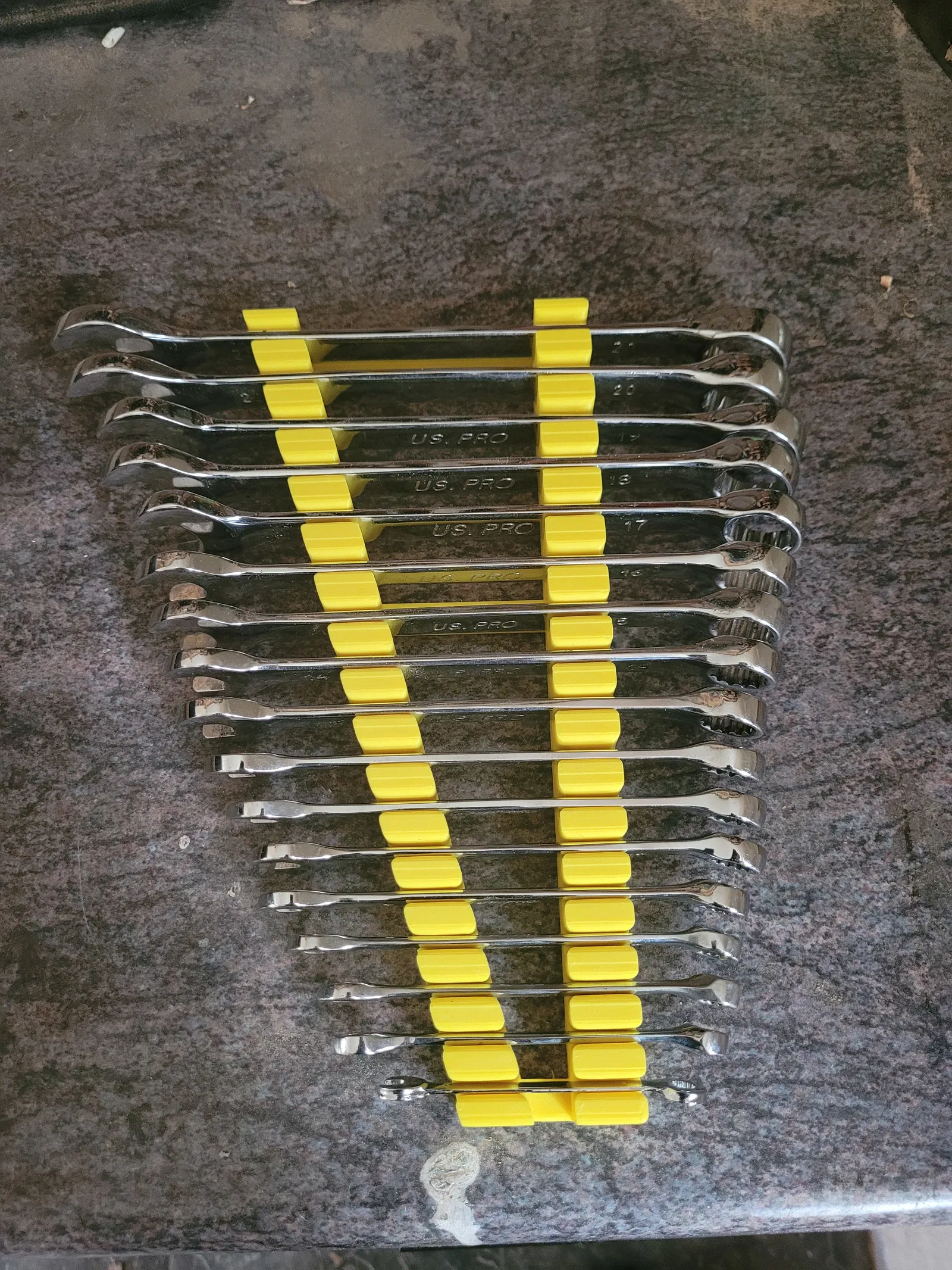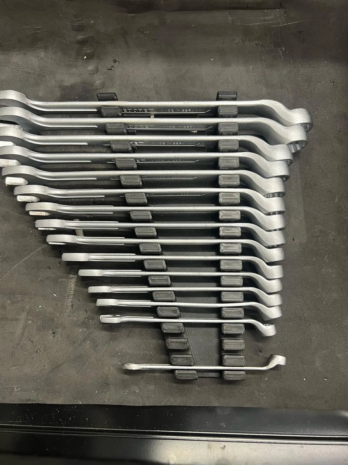 Kệ đựng cờ lê cho hộc tủ dụng cụ, có 2 mẫu, một mẫu có lỗ cho nam châm 6 x 3mm. Thêm một phiên bản tiết kiệm vật liệu hơn.