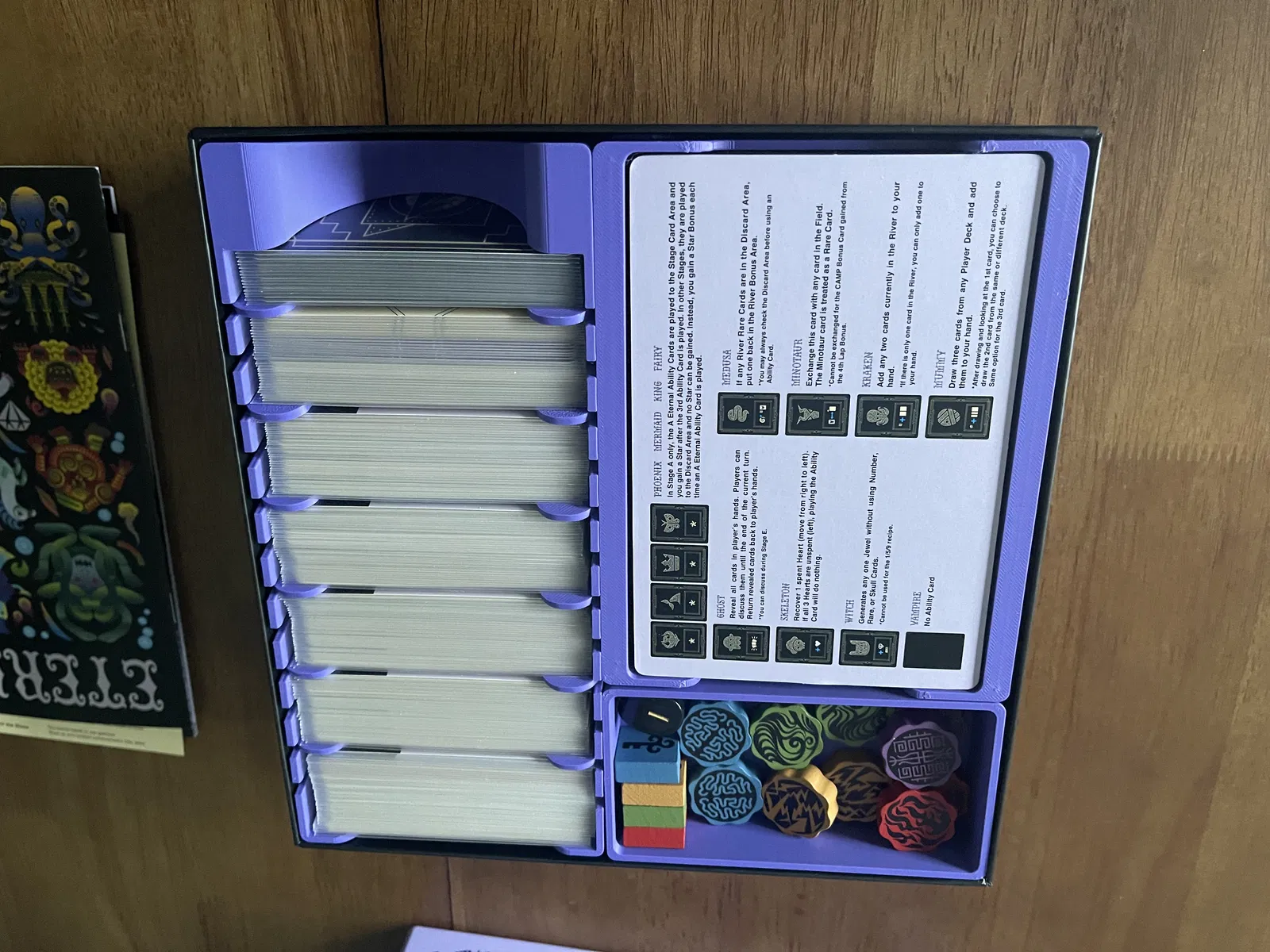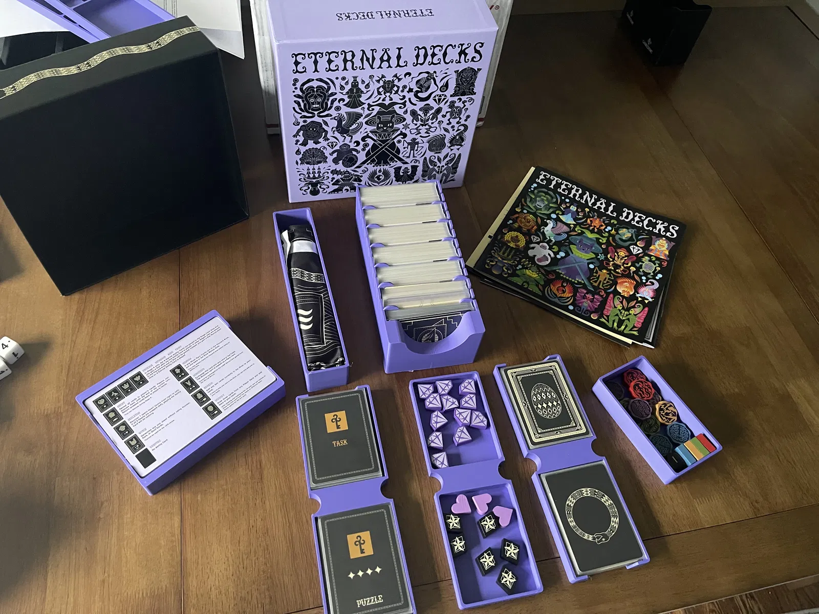 Insert sắp xếp gọn gàng cho board game Eternal Decks (Bản TrickTaker Games). Hỗ trợ đựng có hoặc không có bọc bài, để ngang dọc đều được. Insert gồm 7 phần chính, có khay riêng cho từng loại bài và token, kể cả khay tùy chọn cho play mat.