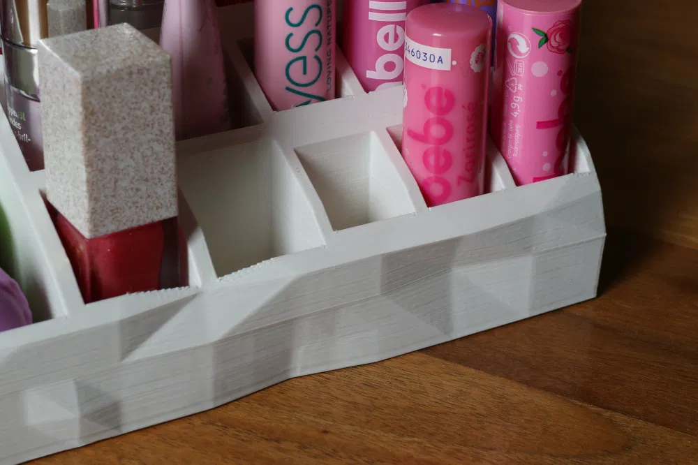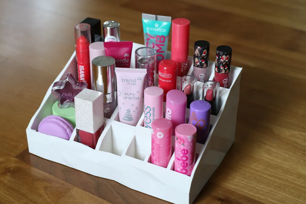 Kệ lớn đựng các vật dụng được sắp xếp phía sau nhau trong các ngăn cao 15mm. Phù hợp cho son môi, son bóng, son dưỡng.