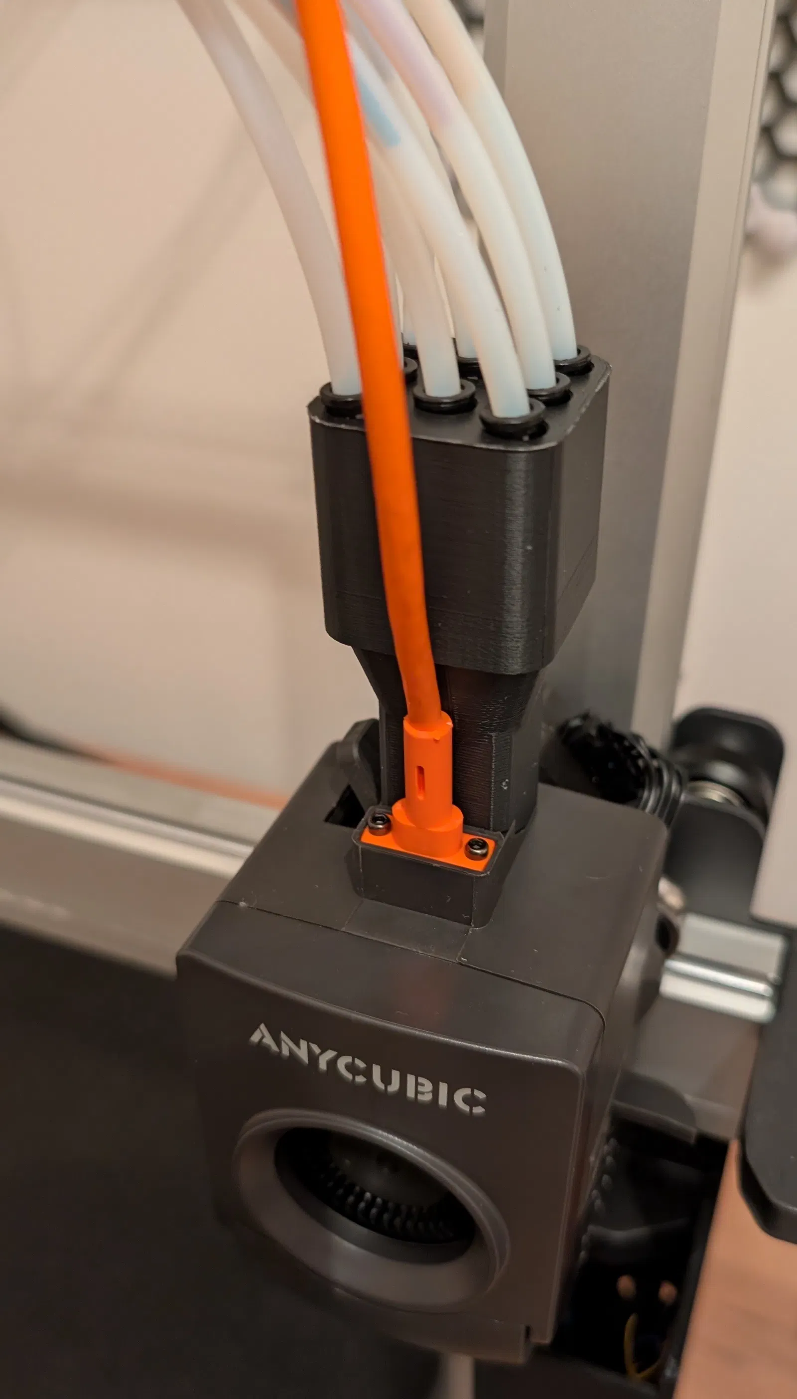 Khi thử nghiệm in bằng ACE Pro, tôi thấy rằng bộ phận mở rộng gốc từ https://wiki.anycubic.com/en/fdm-3d-printer/kobra-3-max/8-input-and-1-output-module không ổn định như tôi mong đợi (mà không sử dụng các phụ kiện ống kim loại như Festo fittings trong các mẫu tương tự). Do đó, tôi đã thiết kế lại bộ phận này để ống PTFE được giữ chặt hơn nhờ (1) đầu nối push fit và (2) chi tiết mới trong thiết kế này. Bạn chỉ cần cắm ống đủ sâu.