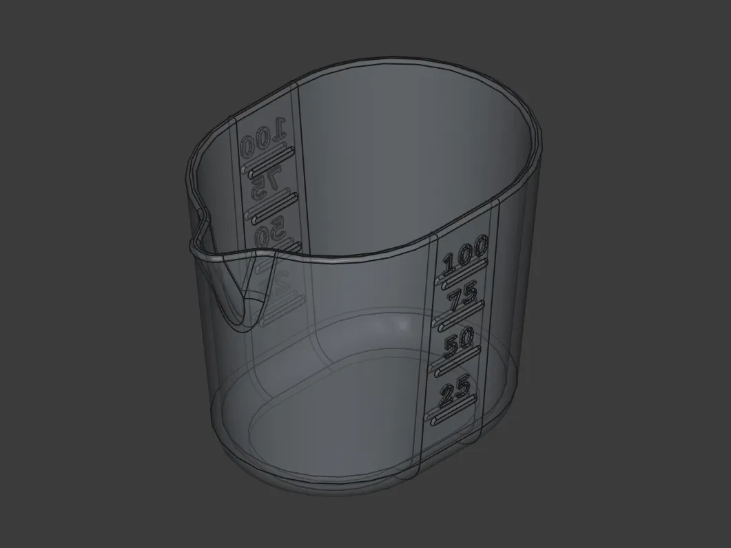 Tui làm cái cốc đong này để đong nước giặt đó. Trên cốc có khắc vạch từ 25 tới 100 ml, mỗi vạch 25 ml nè. Thích hợp để đo lường các loại chất lỏng khác nhau.