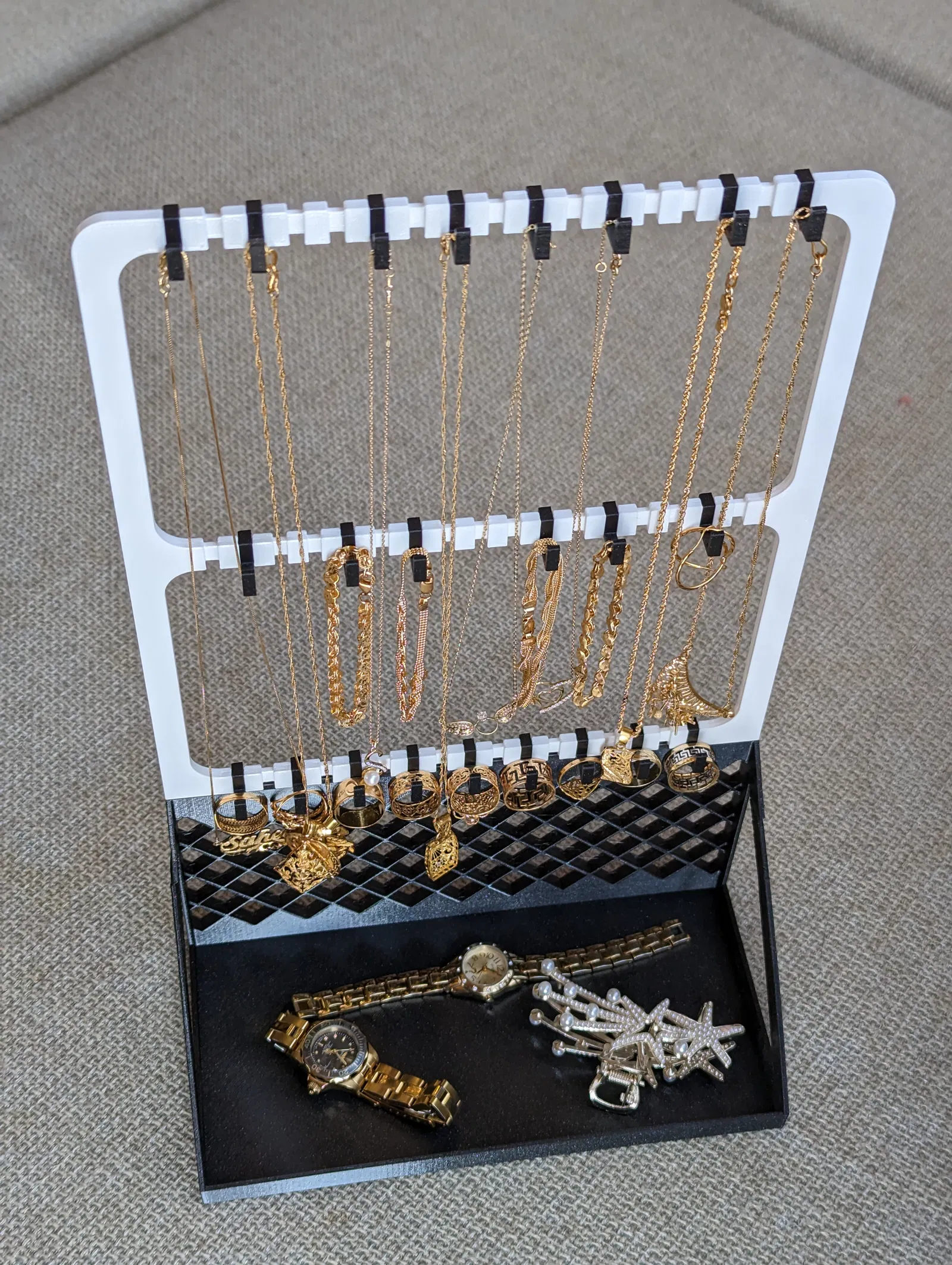Cái giá treo này giúp sắp xếp trang sức của vợ bạn một cách gọn gàng. Có nhiều vị trí để gắn kẹp, bạn có thể tùy chỉnh theo ý thích. In ngon lành với PETG, không cần support nhiều.