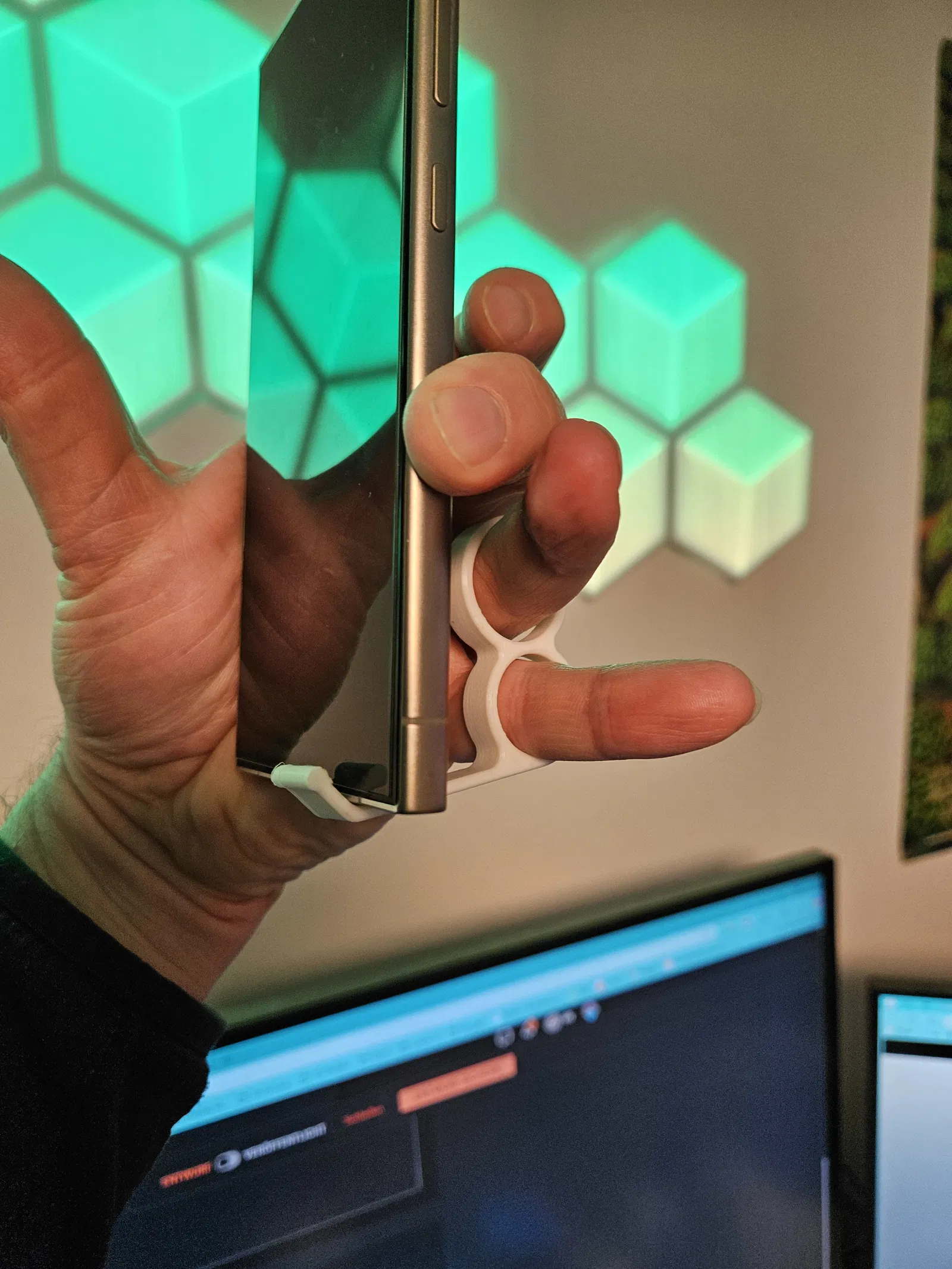 Giá đỡ điện thoại 2 ngón tay, giữ chắc điện thoại, giúp bạn nhắn tin, chụp ảnh đẹp hơn và xem video rảnh tay. Có thể cầm tay hoặc đặt trên bàn. In với 4 lớp vỏ, không cần support khi đặt nghiêng.